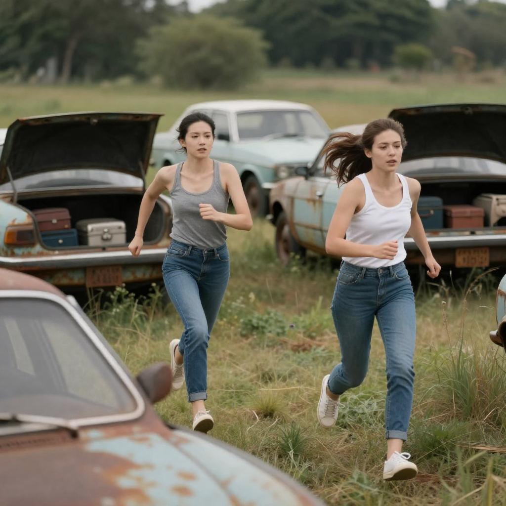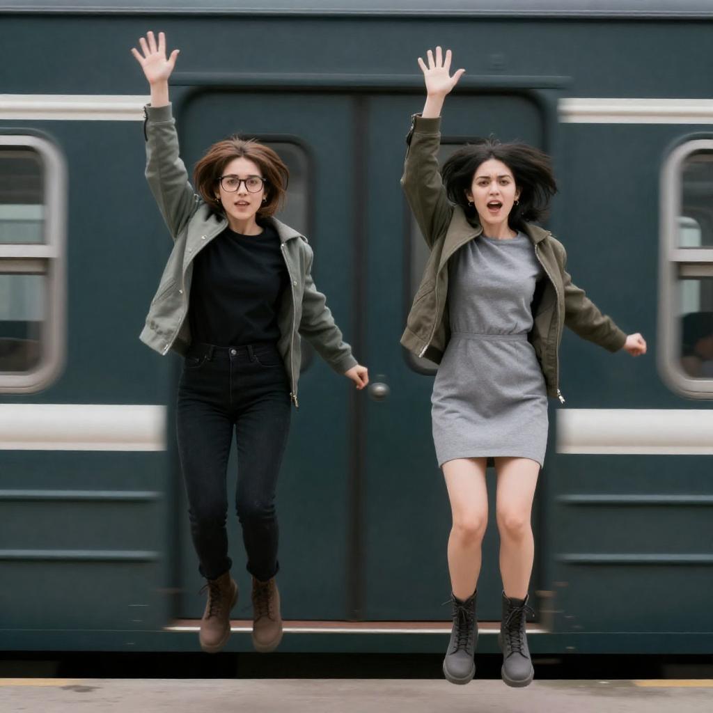 Two young women jumping out of a moving train door. Both have intense expressions, arms raised. One wears a green jacket, black pants, glasses; other wears a gray dress, green jacket, gray boots. Train exterior, blurred background.
