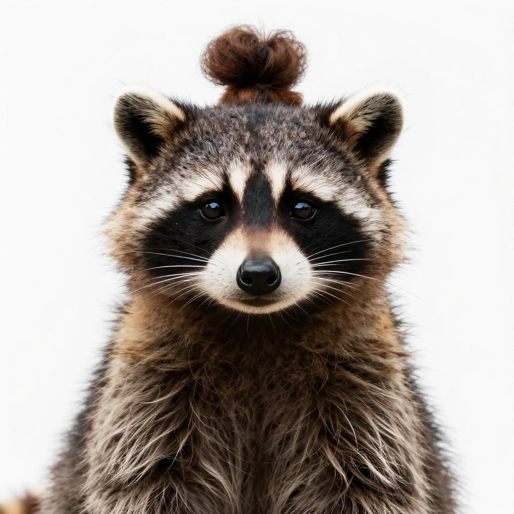 Close-up portrait of a realistic toddler raccoon with long fur and a distinctive hair bun on top of its head. The raccoon has a symmetrical face with dark eyes and a detailed, sharp fur texture. The bright and playful image features a white background, emphasizing the raccoon's expressive and mature look, suitable for children's book illustrations.