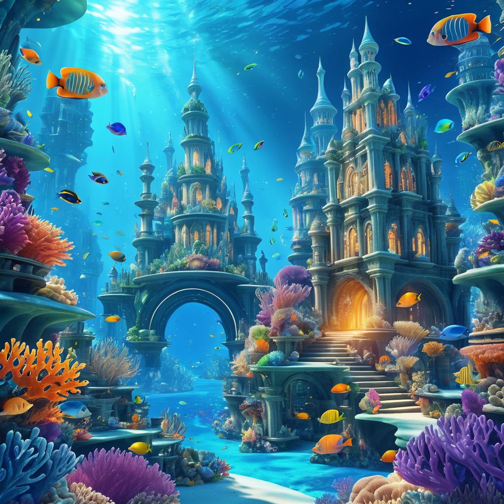 Fantasy scene featuring an underwater city with colorful coral reefs, schools of fish, magical atmosphere, highly detailed.