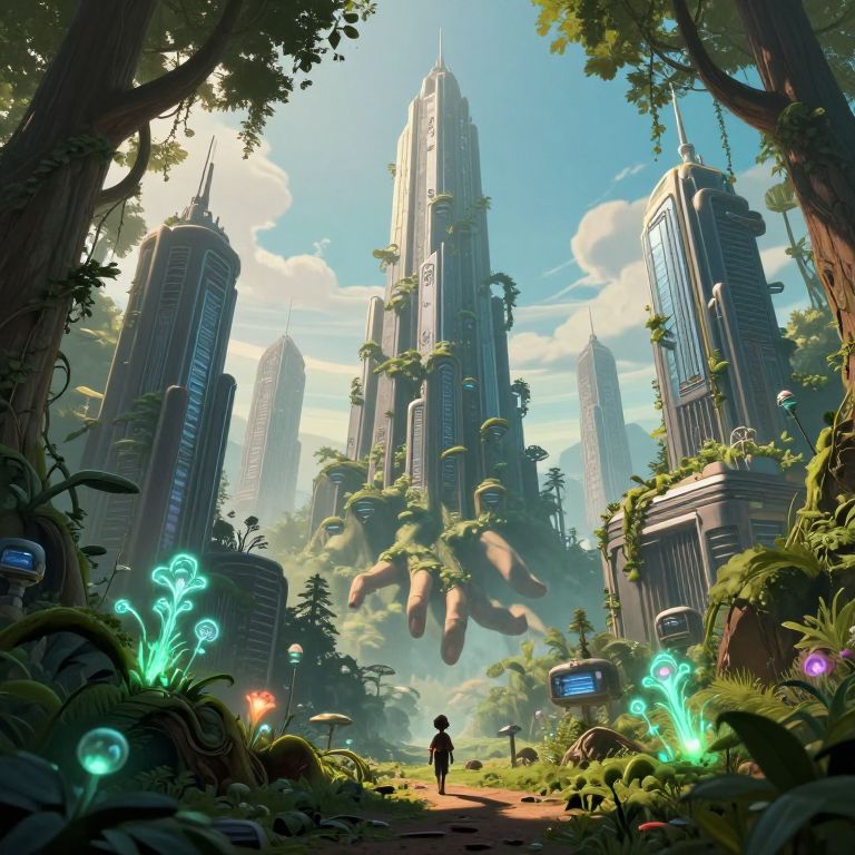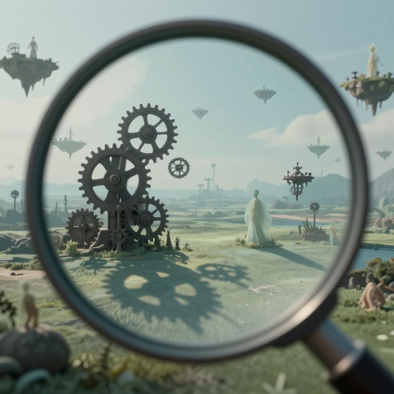 Photograph-style CGI: Magnifying glass focuses on large black gears in a grassy, futuristic landscape with floating islands and people, under a bright blue