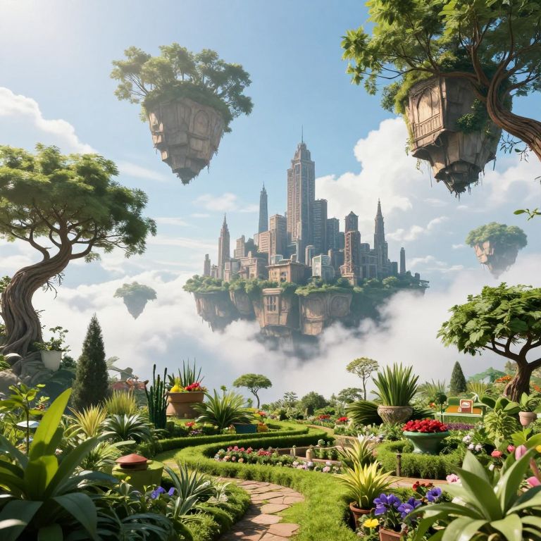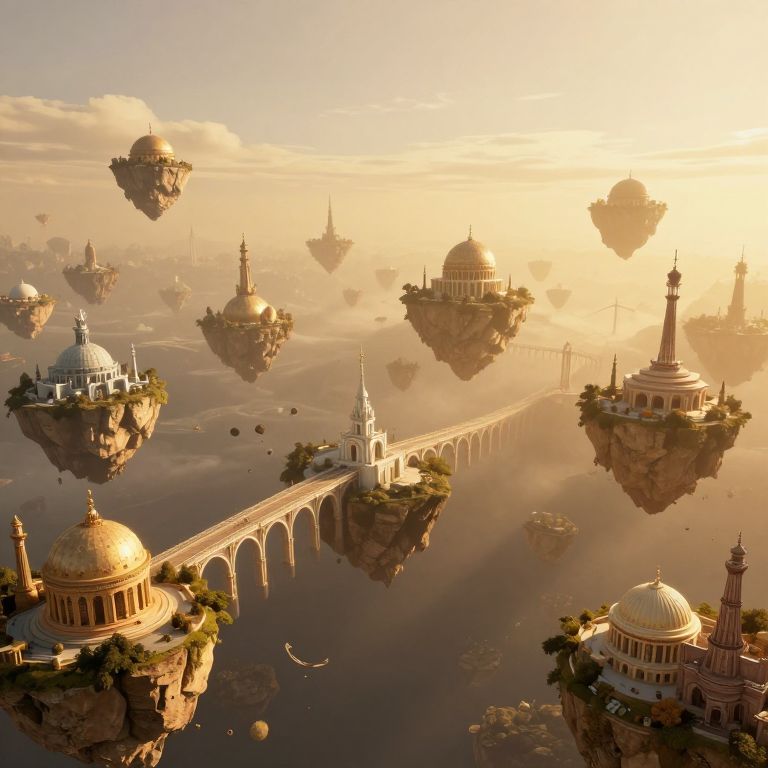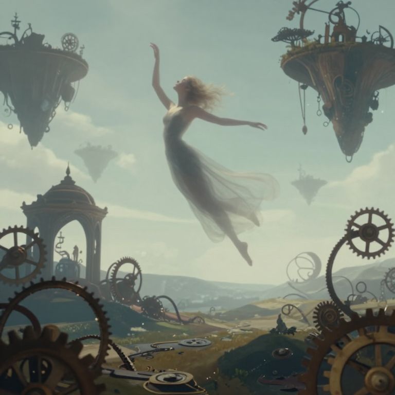 Create an enigmatic dreamscape governed by a colossal timepiece in the foreground, casting elongated shadows across the landscape as if viewed through a magnifying glass from an 'ant's-eye perspective'. Include intricate details reminiscent of melting gears, floating archipelagos, and ethereal figures engaging within this peculiar realm. Employ a muted color palette dominated by soft blues, greens, and grays to imbue a sense of tranquil intrigue. Compose the scene so that it intriguingly balances surreal aspects with familiar objects, inviting viewers to be transported into an imaginative yet contemplative universe where they can explore their own subconscious realms.