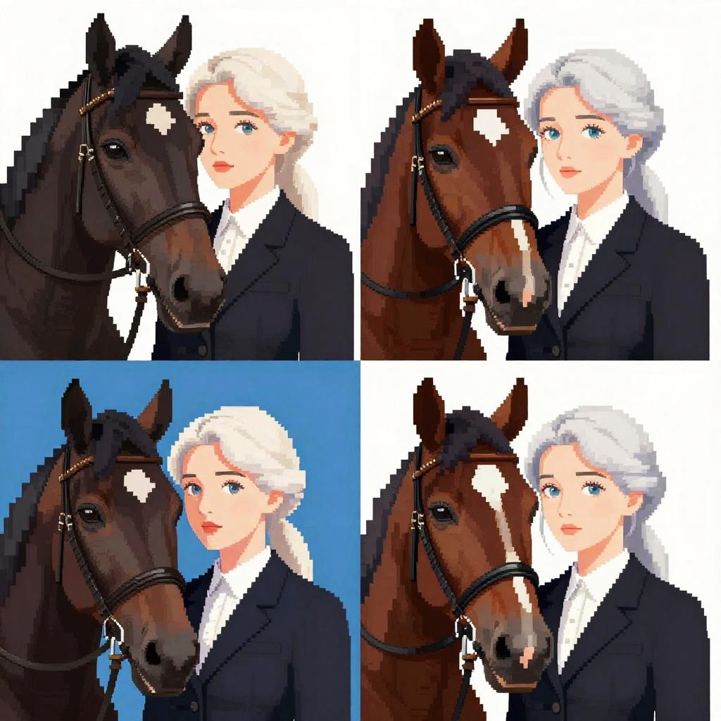 This pixel art image, divided into four quadrants, features a cowboy riding different horses in various scenes. Top left: brown horse, white cowboy shirt, blue jeans, white hat, daytime, blue sky with clouds. Top right: black horse, white cowboy shirt, blue jeans, white hat, nighttime, dark sky. Bottom left: black horse, blue shirt, blue jeans, white hat, daytime, white sky. Bottom right: brown horse, white cowboy shirt, blue jeans, white hat, daytime, blue sky. Each quadrant showcases the cowboy and horse in side profile, with the horses in motion, set against simple, colorful backgrounds.