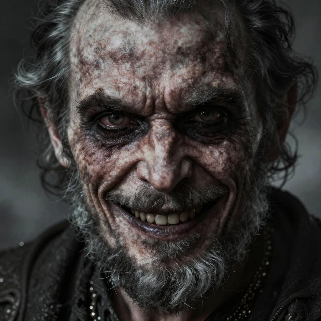 Realistic evil face drawing of a haunted old man with sunken eyes, harsh shadows, a sinister smirk, and coarse beard, highly detailed skin texture highlighting age and malice, dramatic lighting with a foggy backdrop, gothic horror inspiration.