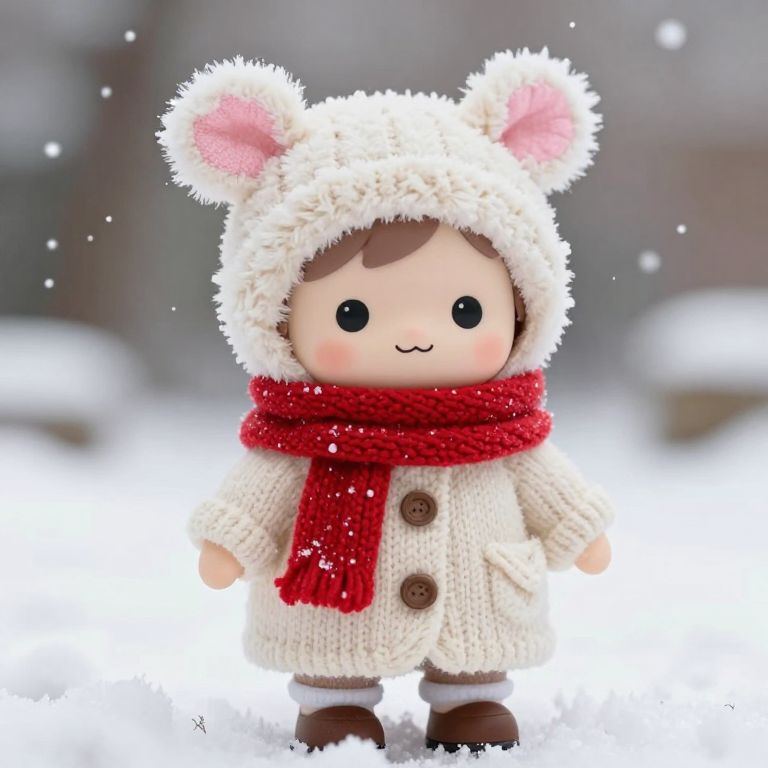 Adorable doll stands bundled in a cozy winter ensemble, featuring a cream knit coat, vibrant red scarf, and matching hat with fluffy pink ears, set against a serene snowy backdrop with delicate snowflakes drifting through the air.