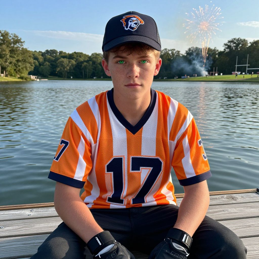 Photo of a teenage boy around 17 with strong cheekbones, bright green eyes, and freckles, dressed as a football Sunday costume — complete with a retro-style striped jersey, team hat, and fingerless gloves — sitting on a wooden dock at a lake during sunny weekend evening, with fireworks in the distance and a football field visible in the background.