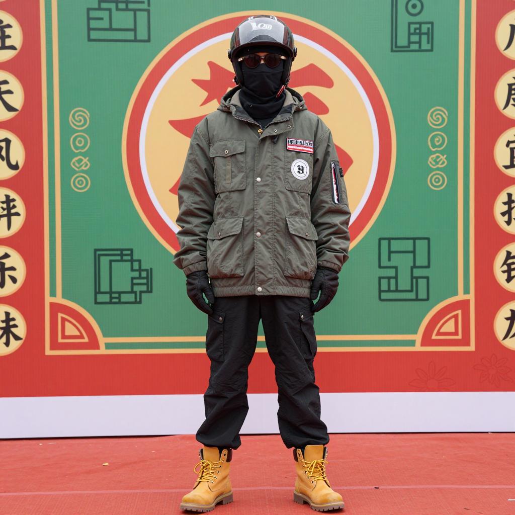Funky costume, photograph of a person standing in front of a colorful patterned background, wearing a hooded jacket with patches, black pants, yellow boots, gloves, and a helmet, red and green patterned backdrop, chinese characters and s on background, red fabric on ground, daytime, casual style, urban setting, realistic, detailed, slightly worn clothing, front view, medium shot