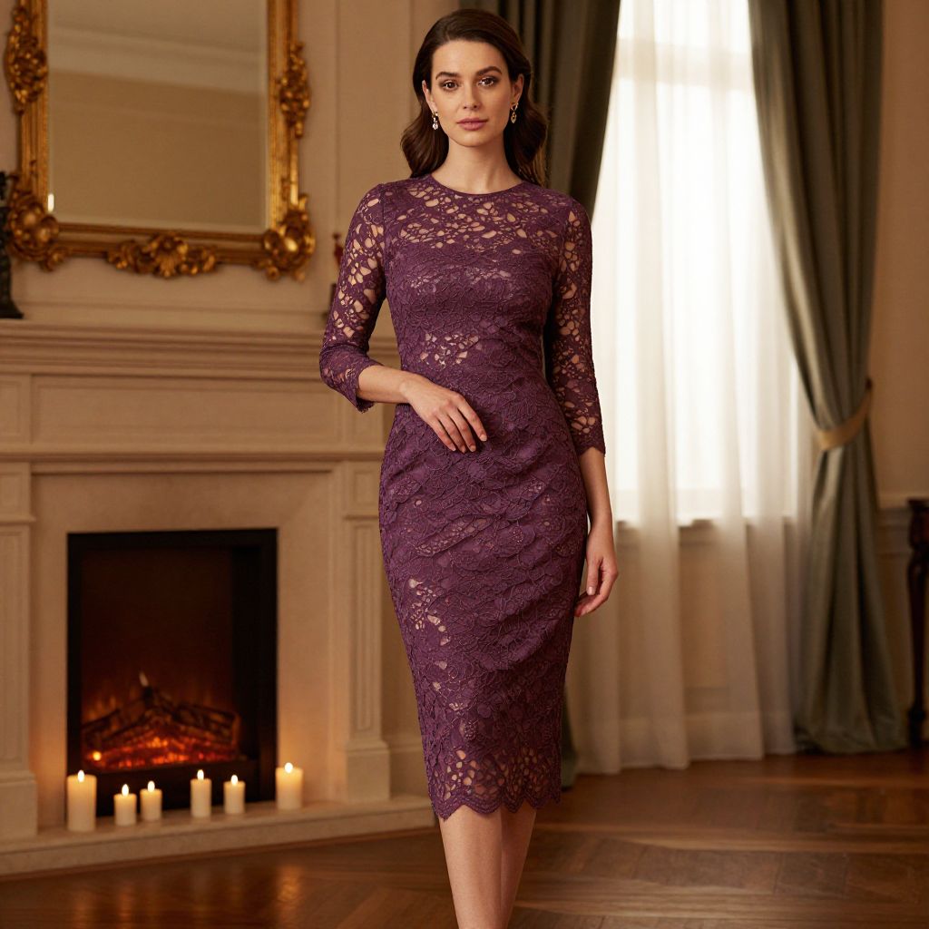 Elegant woman wearing the Simon Lace Midi Dress in Plum stands gracefully in a warmly lit room, featuring a fireplace with flickering candles and a large window draped with sheer curtains, creating a sophisticated and inviting ambiance.