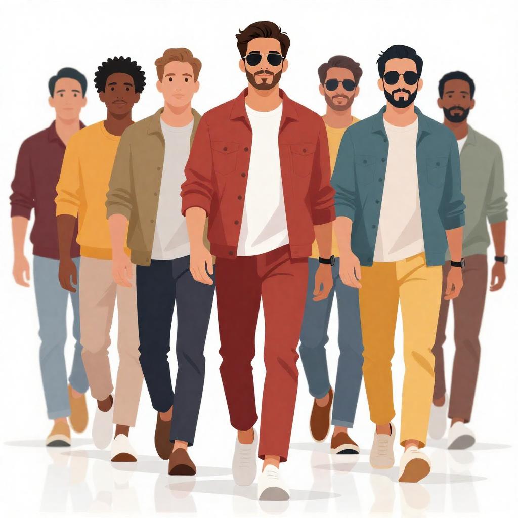 Illustration of six men walking in a line. Central figure in red jacket and pants, yellow pants, black jacket; man next to him in blue sweater and gray pants with a gun. Background is white with a red stripe at top. All men have dark hair and serious expressions. Man on right holds a book. Reflections on ground.