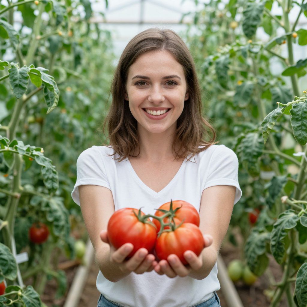 Smiling Woman with Vibrant Tomatoes