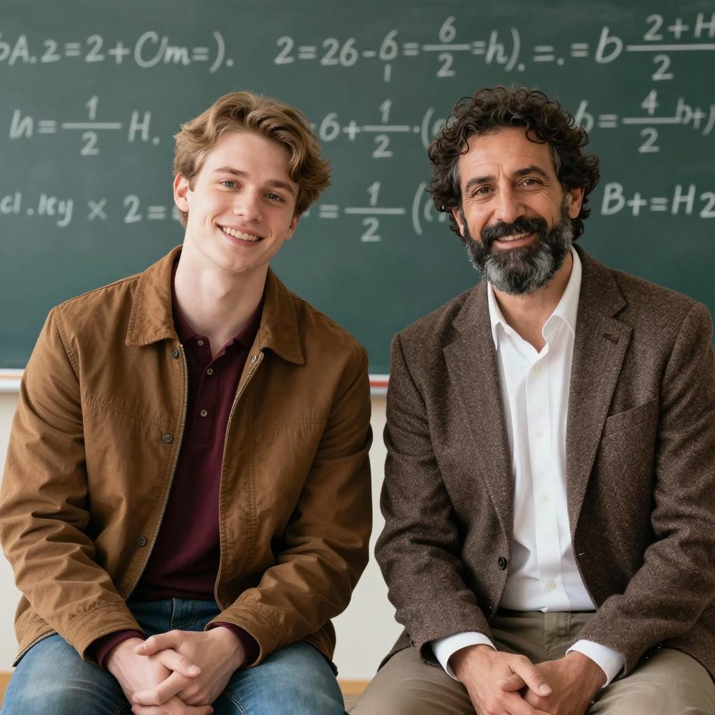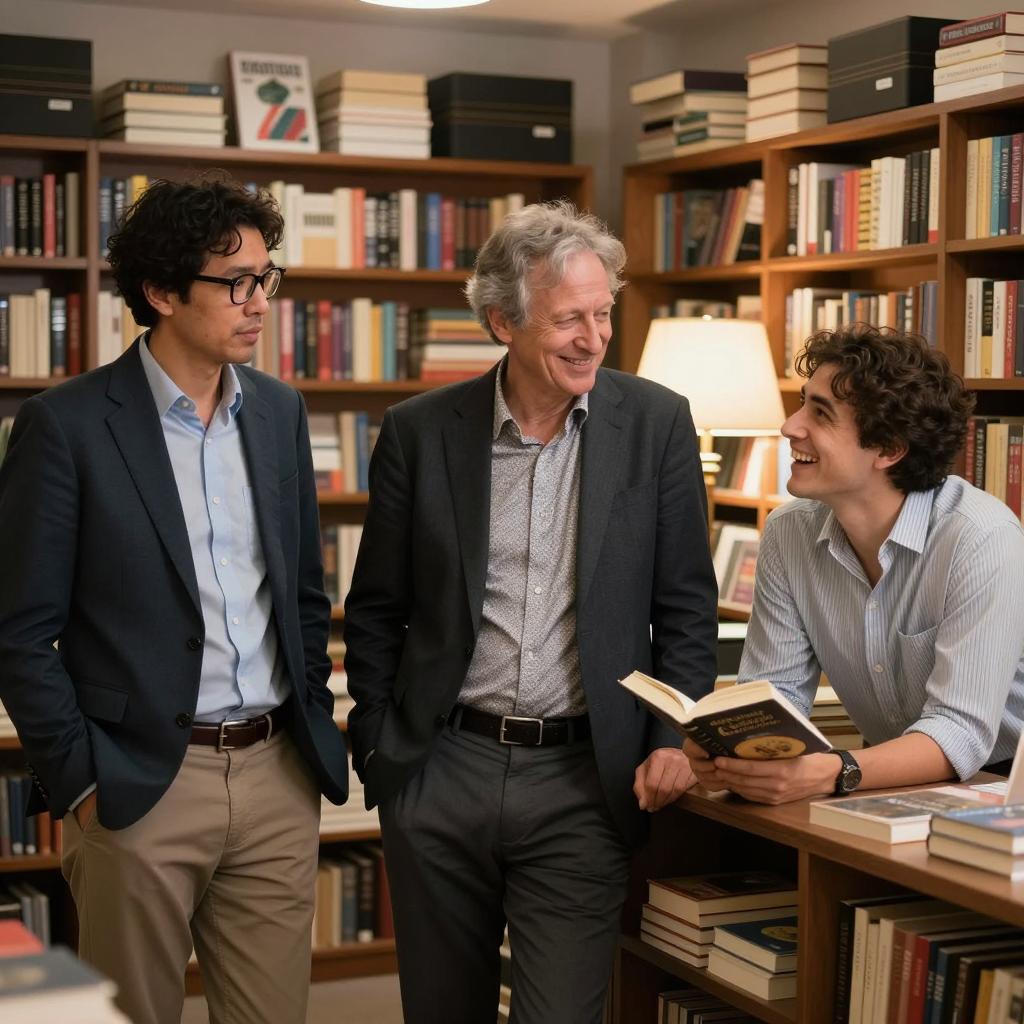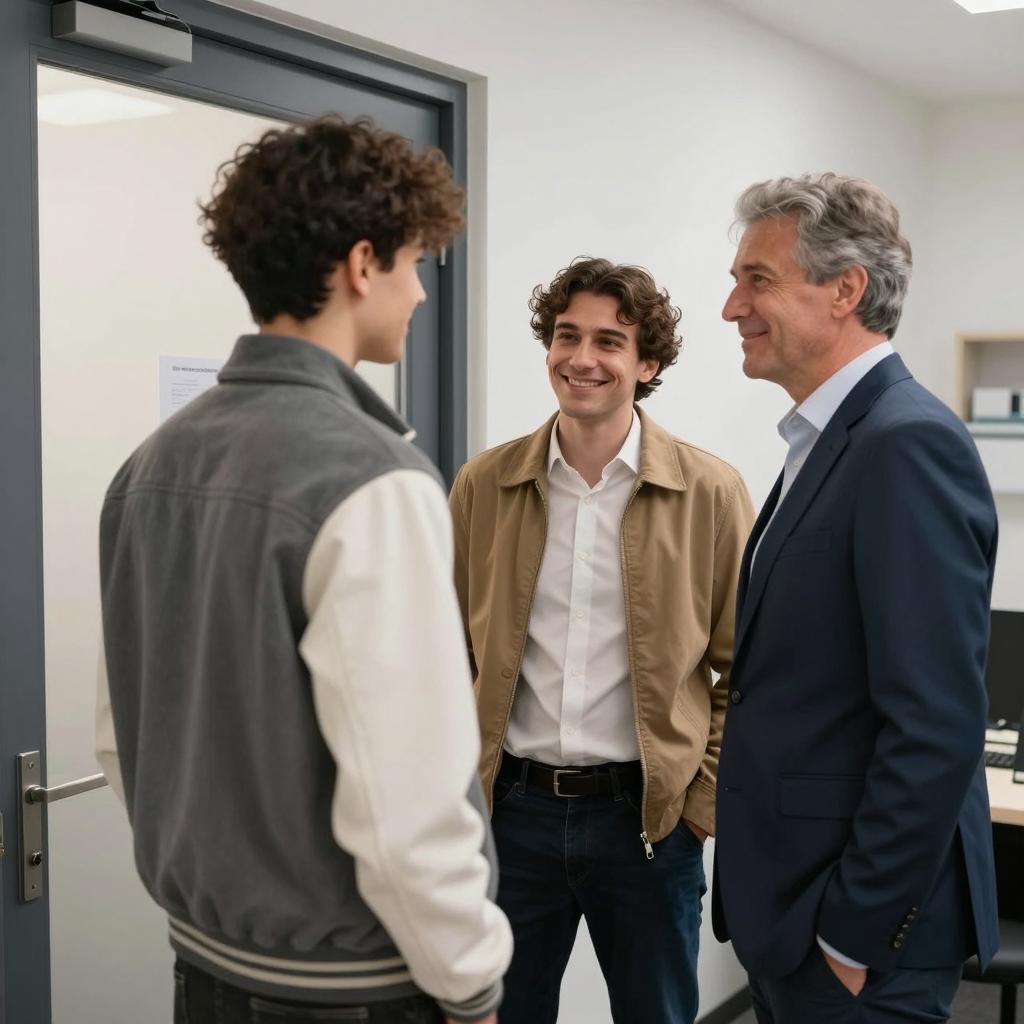 Three people standing near a door. Young man with short dark hair, gray and white jacket, facing right, looking at middle-aged man with curly brown hair, tan jacket, and white shirt, smiling. Middle-aged man in blue suit, white shirt, facing young man, looking at him. Door with frosted glass and black frame on left, office interior with visible sign and shelves in background.