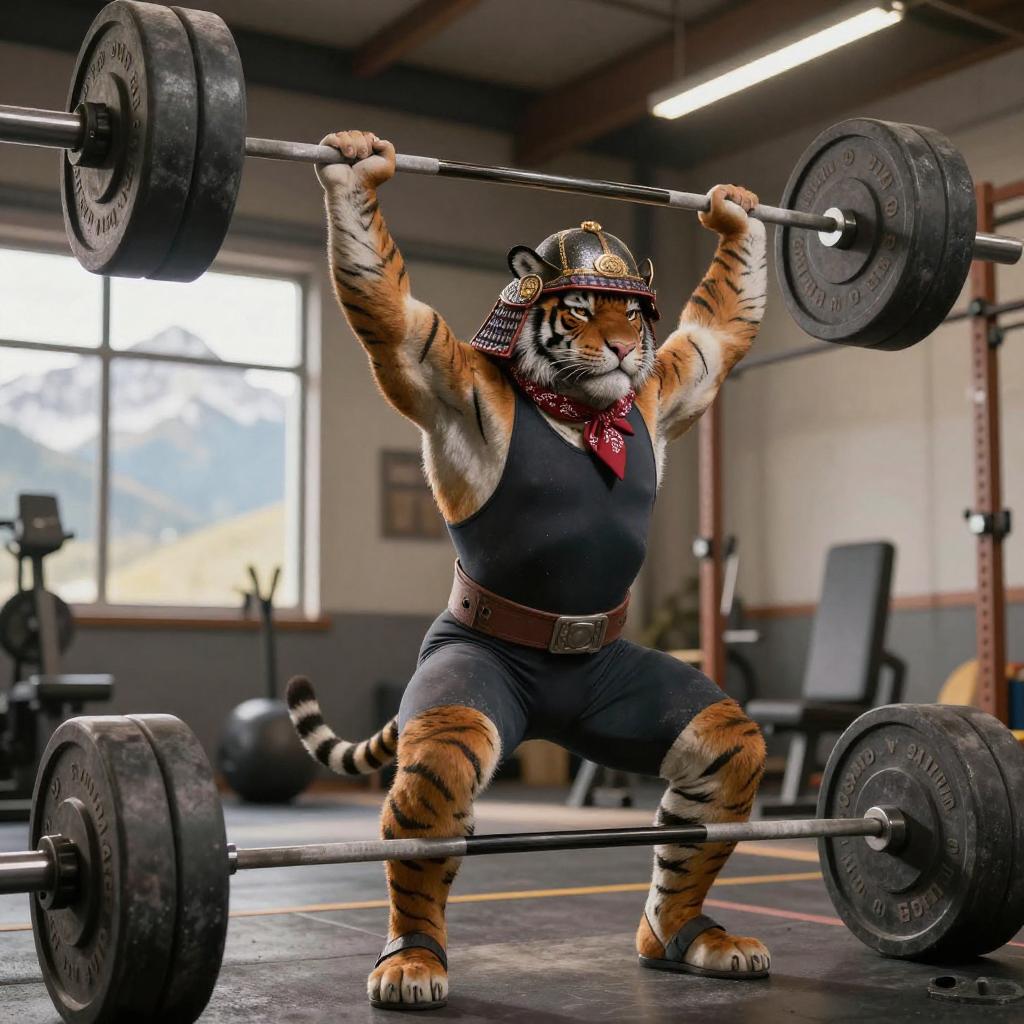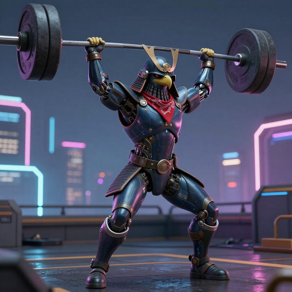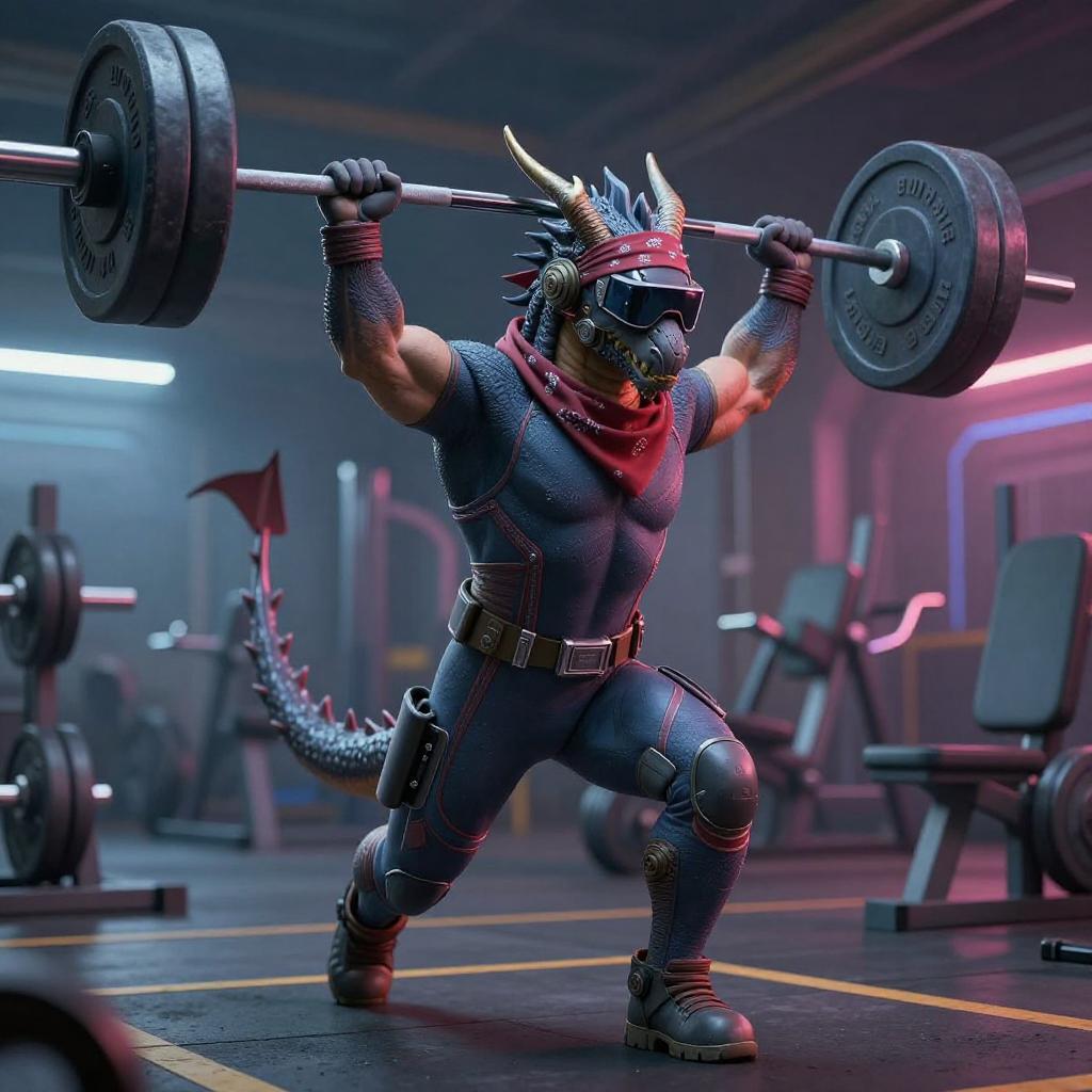 A anthropomorphic cheetah hurdler performs a powerful deadlift in a futuristic neon-lit stadium, wearing a sleek aerodynamic helmet and streamlined sports suit with a bandana, gripping a heavy barbell overhead, ultra-detailed textures, intricate sculpting, cinematic volumetric lighting.