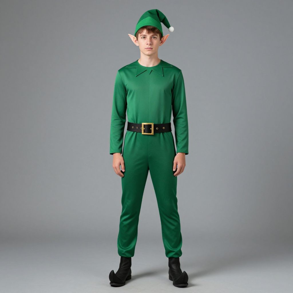Adult elf jumpsuit costume, 1boy, male focus, solo, pointy ears, belt, hat, green headwear, green tunic, standing, tunic, full body, green shirt