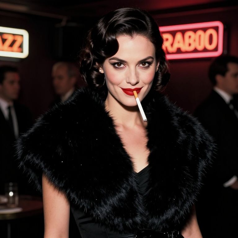 Photograph of a glamorous woman with fair skin and dark, wavy hair styled in a vintage, 1950s updo. She wears a black fur stole over a black dress, with striking red lipstick and a cigarette held in her right corner of her mouth. Her intense gaze is directed at the camera. The background is dimly lit, featuring neon signs with "RADIO" in red and "ZZZ" in yellow. Blurred figures of men in suits are visible, suggesting a vintage nightclub or bar setting. The overall mood is seductive and retro.
