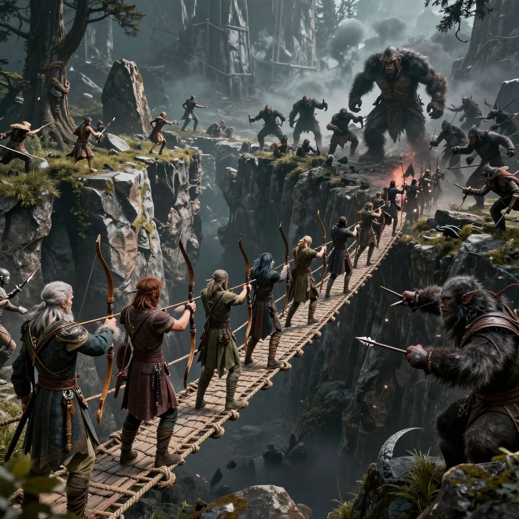Epic fantasy battle scene: warriors with swords and bows fight giant orcs on a wooden bridge amidst rocky cliffs and dense forest. CGI artwork with intense