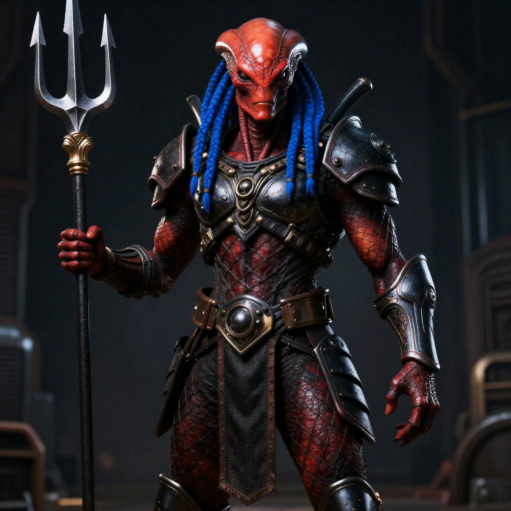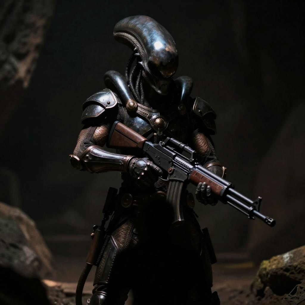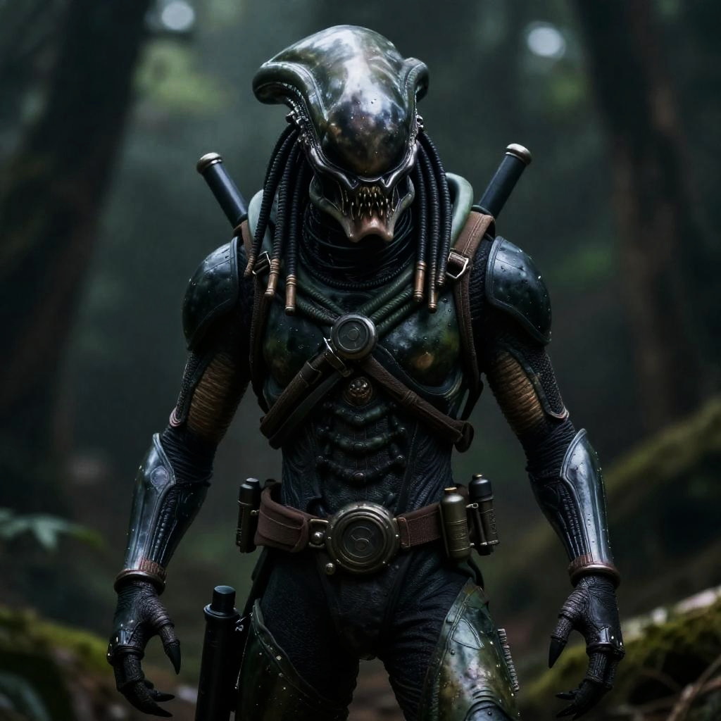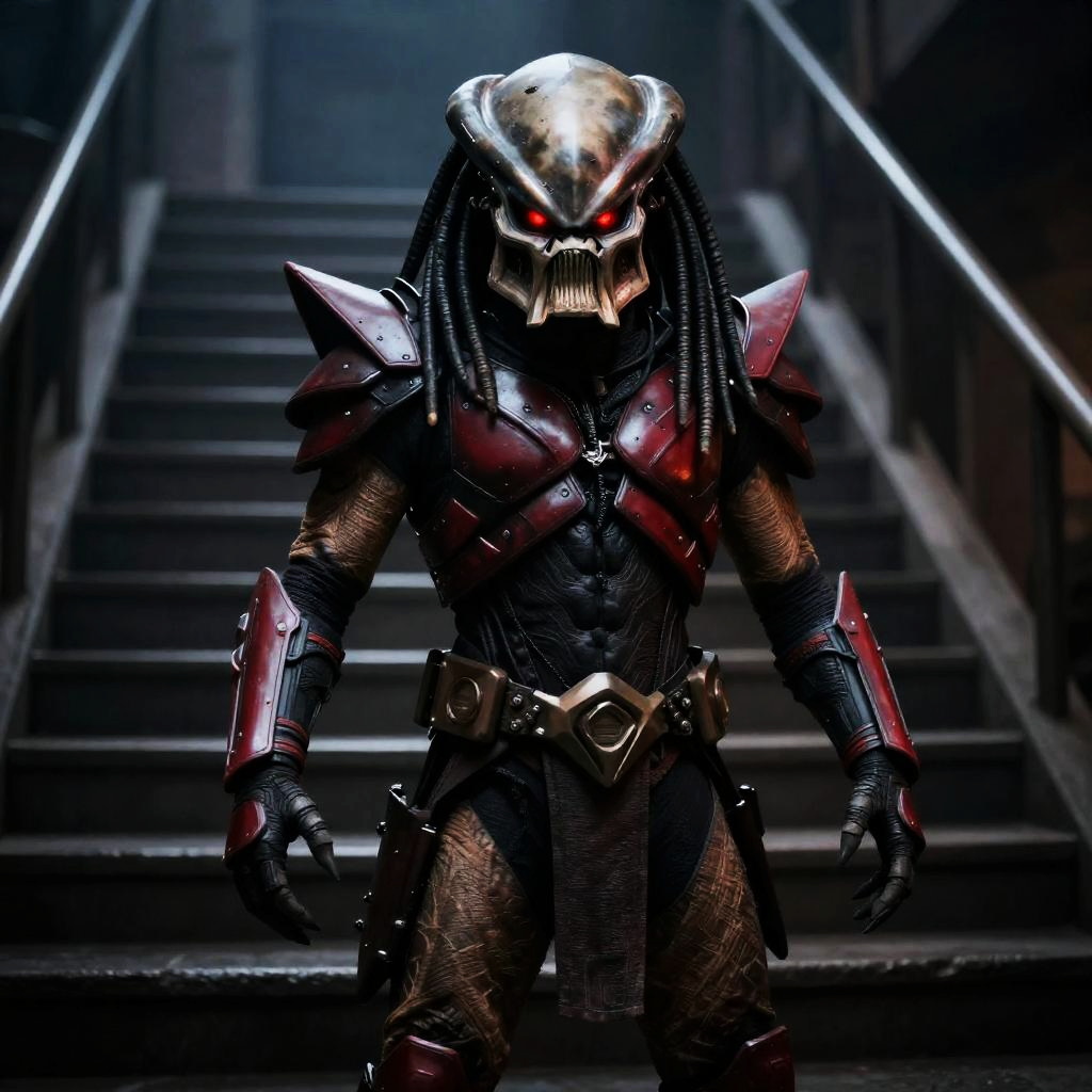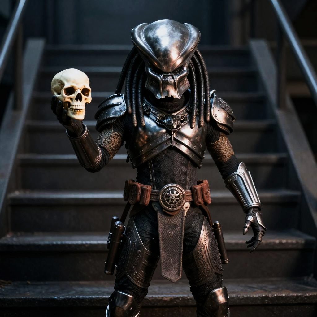 Photograph of a Predator warrior in detailed metallic armor with black dreadlock-like appendages, holding a small skull in his right hand. He stands on dark, industrial stairs with a dimly lit background. His armor is intricately ured, and his head is lowered slightly. The Predator's pose is tense, with fingers curled around the skull. The lighting emphasizes the metallic sheen of his armor.