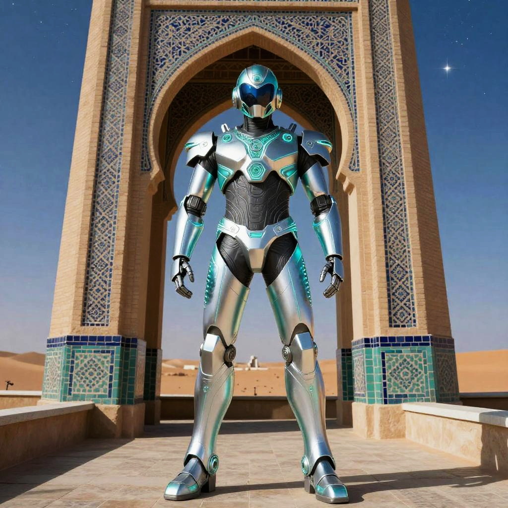 CGI image of a futuristic, silver and black robotic warrior standing in front of an ornate, blue-tiled archway in a desert. Clear
