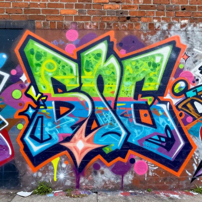 Make your own graffiti mural concept, close-up of a hand drawing intricate graffiti shapes on a brick wall, neon colors blending with splashes of paint, expressive lettering styles, industrial urban setting, dynamic and edgy atmosphere