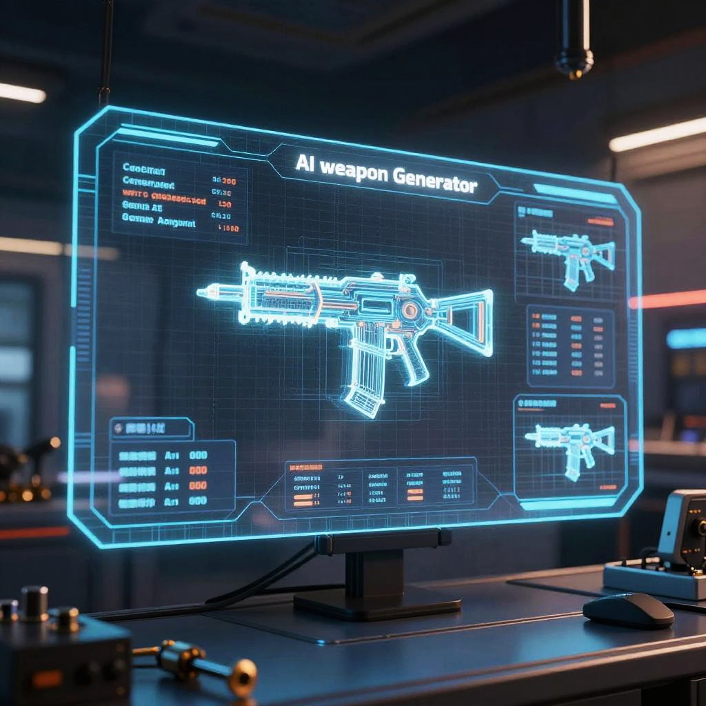 AI weapon generator interface in a sci-fi control room, holographic displays showing weapon stats and 3D models, electronic components and machinery in the background with neon highlights, cybernetic and innovative technology theme, highly detailed and futuristic