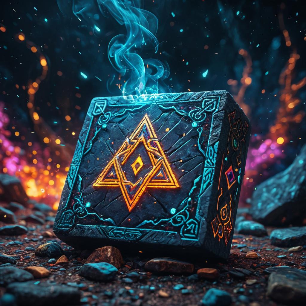 Detailed close-up of a magical rune stone glowing with blue and orange cosmic energy. The stone is intricately engraved with geometric patterns and emits a soft smoke, set against a dramatic, colorful, and blurred background with glowing particles. Fantasy concept art inspired by surreal and mystical themes.
