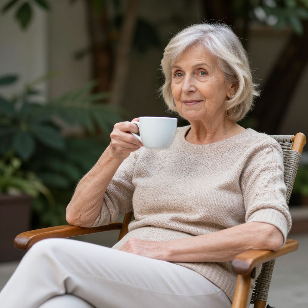 Photograph of an elderly woman with short, silver-gray hair, sitting in a wooden chair with a wicker seat. She wears a beige, knit sweater and white pants, holding a white ceramic mug in her right hand, raised to her mouth. Her expression is gentle and content. The background features blurred green plants and a dark, out-of-focus wall. The image has a soft, natural light, emphasizing her serene and relaxed demeanor. The texture of the knit sweater contrasts with the smooth mug and her white pants.