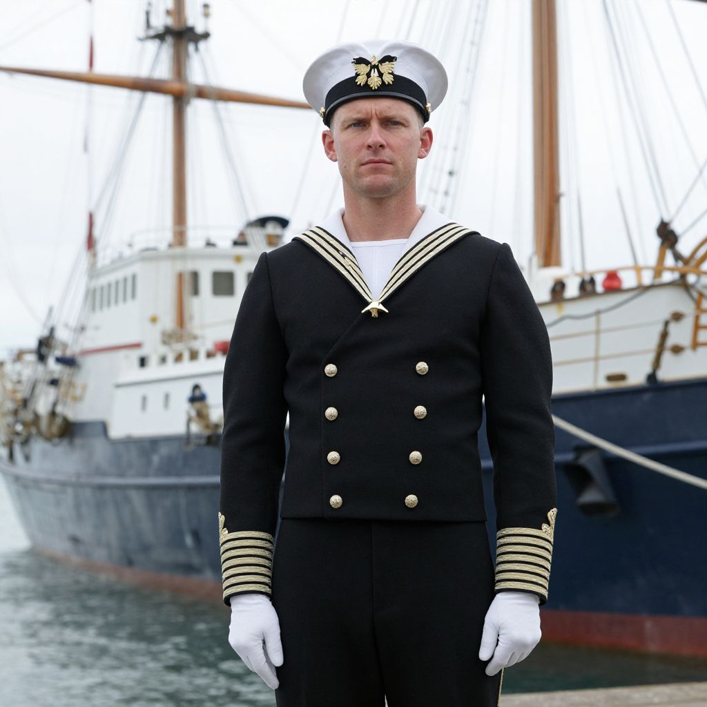 British Naval Officer, man in a navy uniform standing in front of a ship