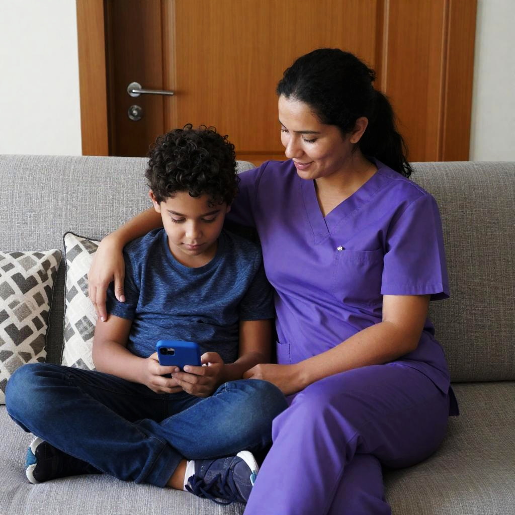 Two people lying on a couch. Young person with short brown hair, wearing a blue shirt, holds a phone, relaxed. Older person with light brown hair, wearing a white shirt, looks at a tablet. Soft lighting, pillows, teal and pink accents.