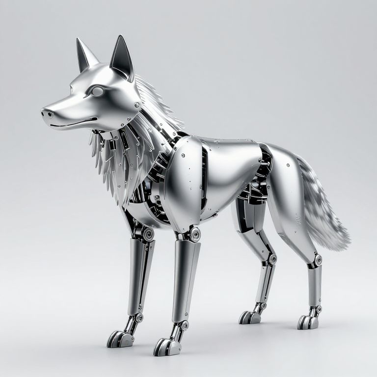 Slippery robotic wolf made of metallic shiny chromed silver, minimalistic, full body shot, modular elements attached, by Hajime Sorayama,
