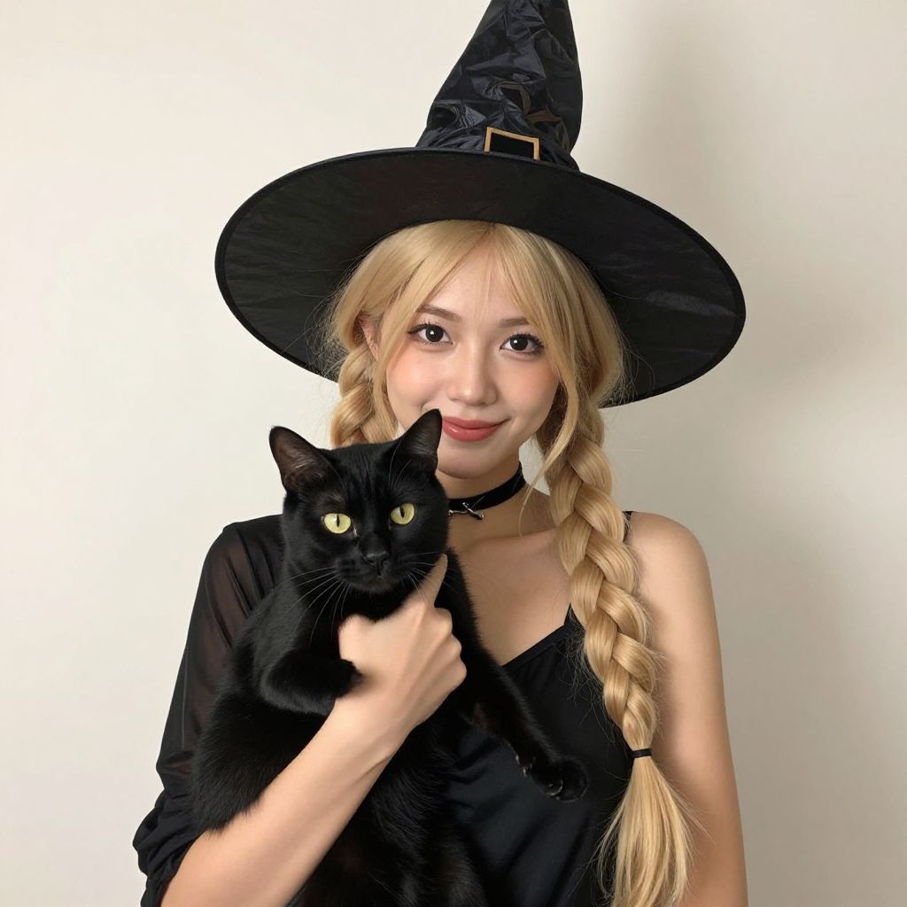 Photograph of an Asian woman with long blonde hair in a side braid, wearing a black witch hat and a black choker, dressed in a black sleeveless top. She holds a sleek black cat with yellow eyes close to her face with her right hand. The background is a plain white, making the subjects stand out prominently. The woman has a subtle smile and light makeup, with her hair and cat's fur contrasting against her black attire. The cat's eyes are slightly narrowed, giving it an alert expression. The overall composition is crisp and vibrant.