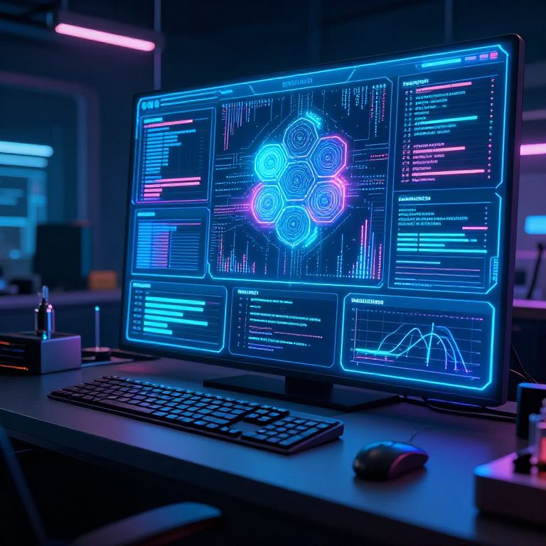 Photograph of a modern, dimly-lit office desk with a glowing, blue and purple neon-lit computer monitor. The monitor displays intricate, neon-coded data visualizations, including a central hexagon pattern and text lines. A black keyboard and a gray mouse sit in front of the monitor. The background features blurred office elements with pink and blue neon lights, adding a futuristic atmosphere. The overall scene conveys a high-tech, tech-savvy workspace.