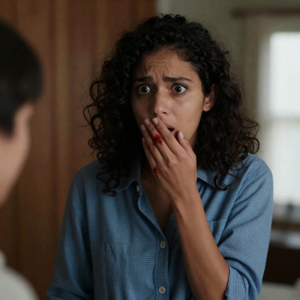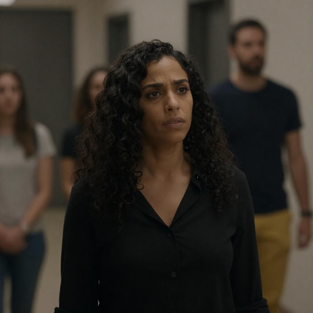 Photograph of a woman with medium brown skin, curly dark hair in a bun, wearing a black cardigan over a green top, standing indoors. She has a surprised expression, mouth open. Background includes a wooden door with glass panels, string lights, and a framed mirror. Bright lights are blurred in the foreground.