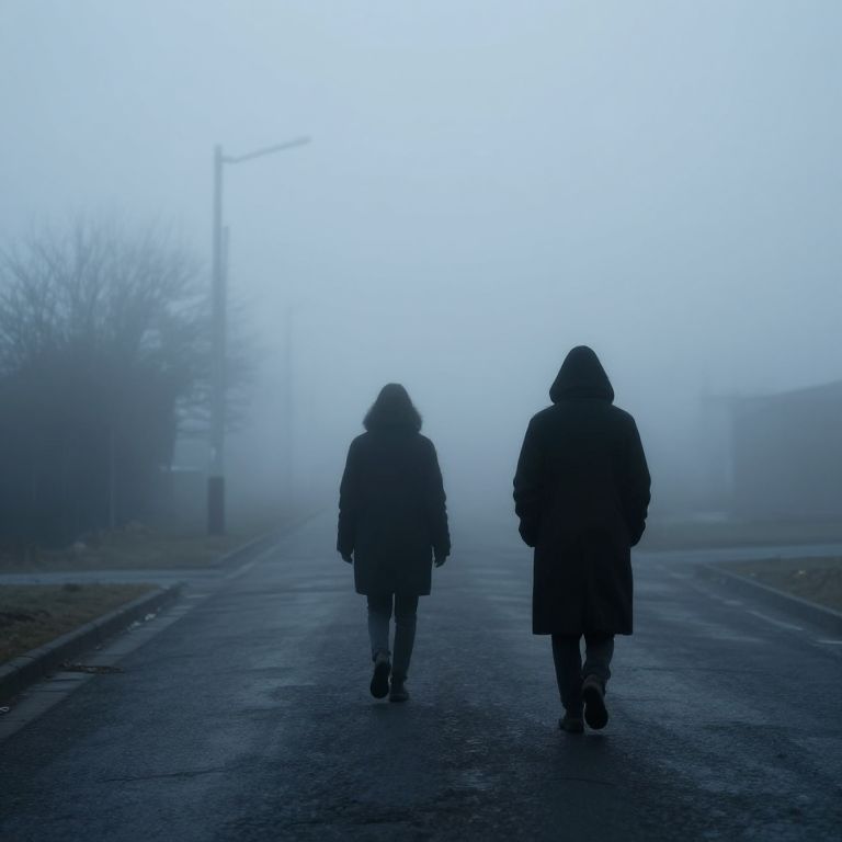 In the hushed embrace of fog, two solitary figures traverse a desolate street, their forms cloaked in shadow, evoking a profound sense of isolation and the quiet weight of existential solitude.
