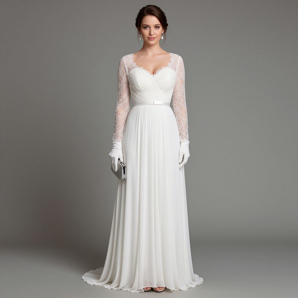 Photograph of a young woman standing against a plain gray background. She has fair skin, dark brown hair styled in an elegant updo, and is wearing a white, long-sleeved, lace wedding dress with a deep V-neck. The lace is sheer and extends to the sleeves, which are slightly puffed. The dress has a fitted bodice and a flowing, pleated skirt that reaches the floor. She is also wearing white lace gloves and black strappy high heels. Her expression is neutral, and she holds a small black clutch in her right hand. The lighting is even, highlighting the dress's texture and her figure.