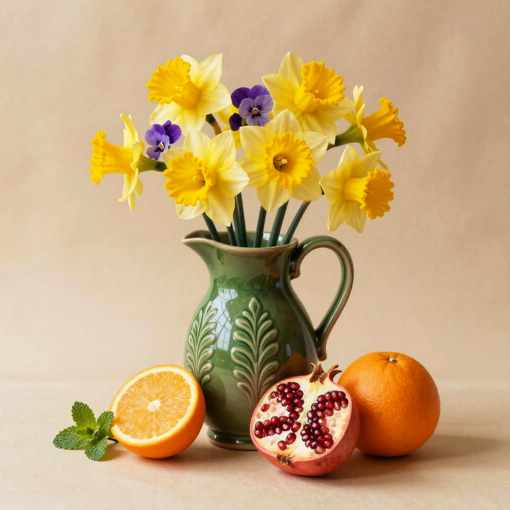A still life painting of a hand-painted turquoise folk art ceramic pot with floral designs brimming with white camellias, eucalyptus leaves, and bright yellow mimosa blossoms. In front rest a sliced orange with seeds, a halved pomegranate, and a whole orange on a clean surface; the natural beige linen texture keeps focus on form and color. Warm, balanced composition, soft natural light, gentle shadows, crisp edges, high detail, tasteful negative space, editorial quality, SDXL ready.