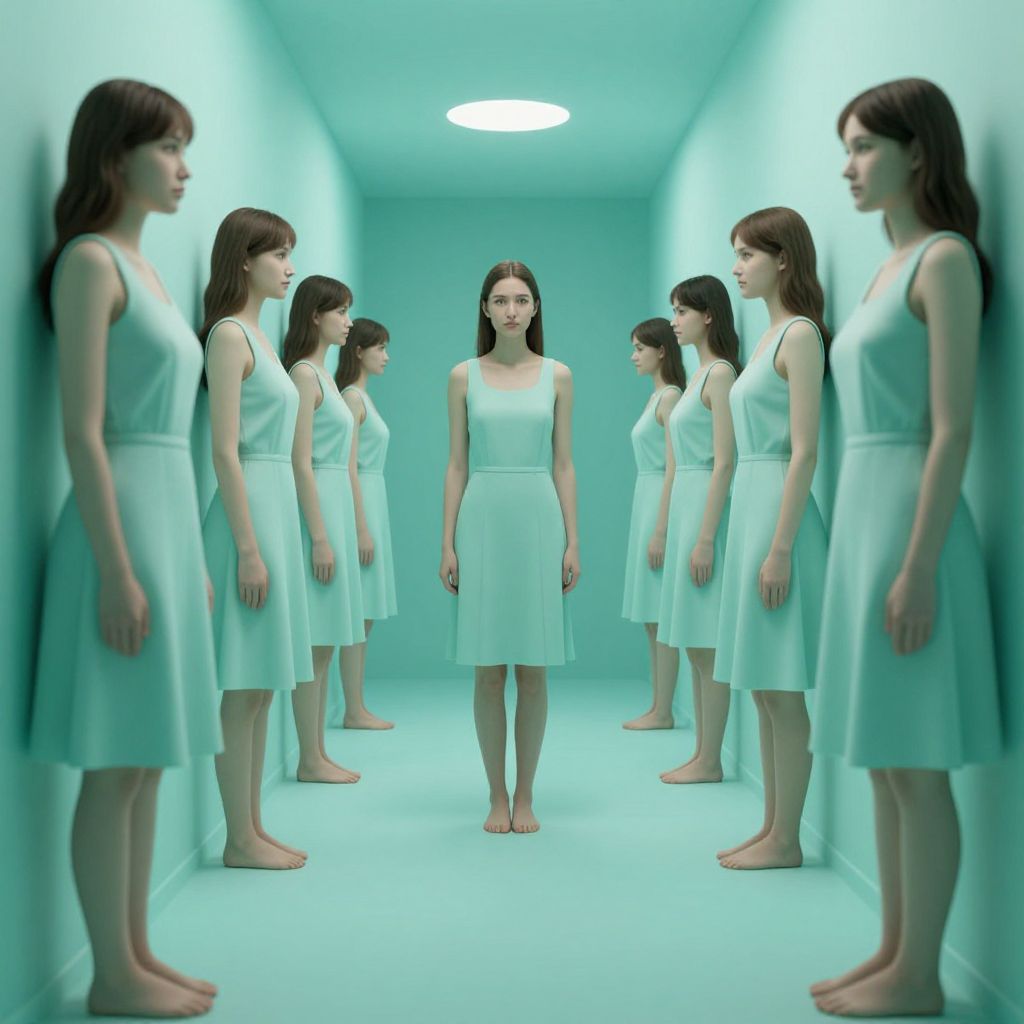 A digitally rendered, surreal photograph features a central young woman with pale skin and long brown hair, wearing a simple, sleeveless white dress, standing barefoot in a brightly lit, narrow, green-lit hallway. She faces forward, flanked by seven identical women, also with pale skin and brown hair, wearing matching white dresses, standing in a mirror-like arrangement on either side. The background is a smooth, greenish wall with a circular ceiling light above. The women's expressions are neutral, and the hallway's symmetrical perspective creates a sense of repetition and symmetry.