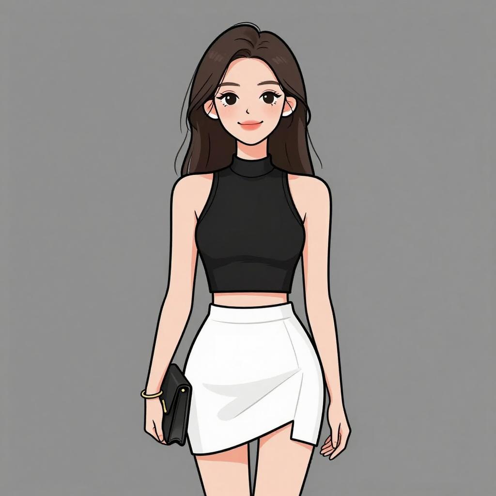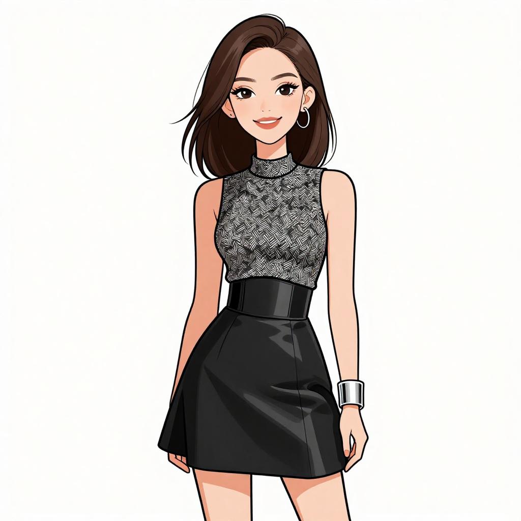 Woman with pretty face and pretty hair. smiling Woman, chic, monochrome textured sleeveless top, high neckline, black faux leather panel at waist, flared mini skirt, wide silver cuff bracelet. --sref 1467
