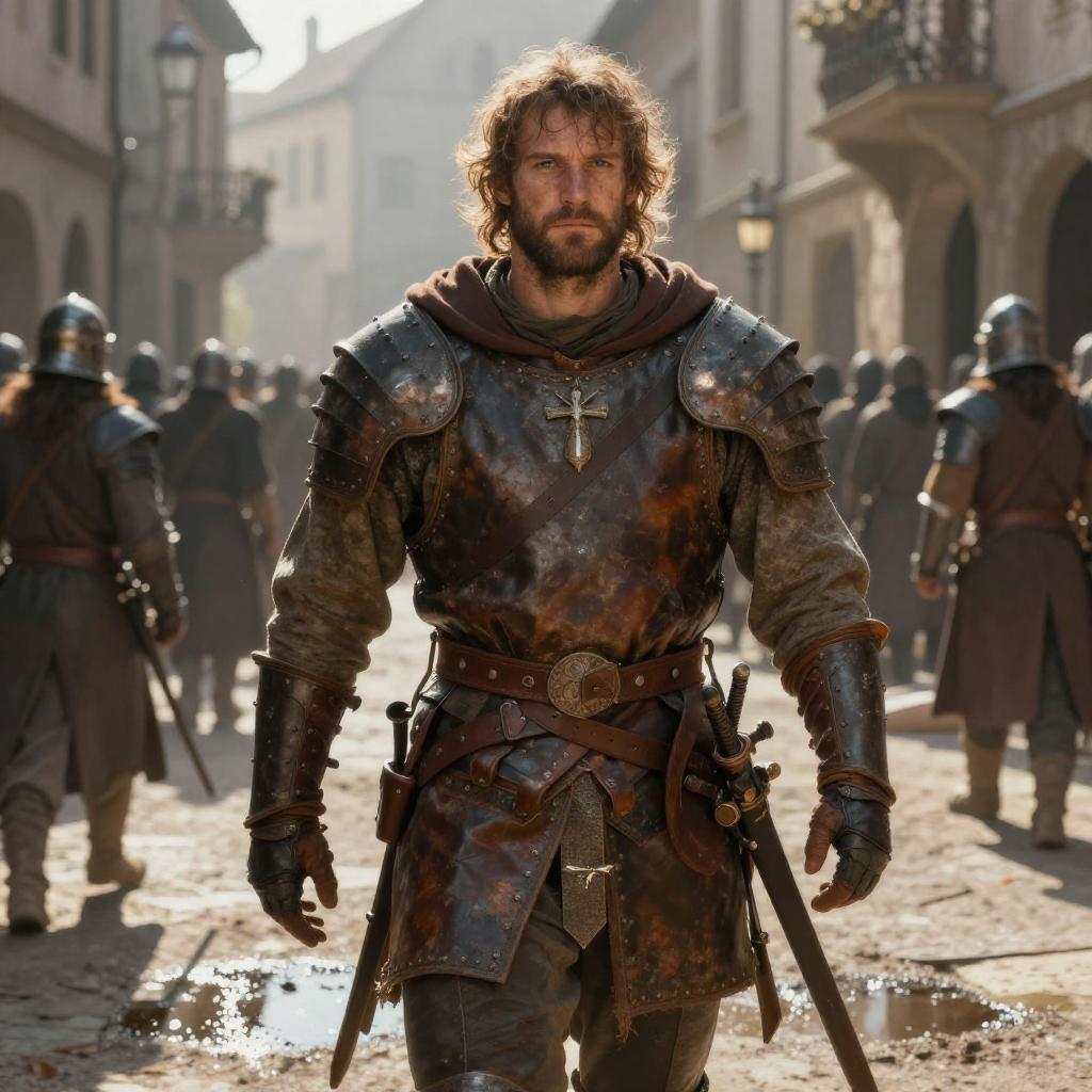 Portrait of a muscular rugged warrior in a bright medieval street, ((old worn leather armor)), ((backlighting)), realistic, masterpiece, highest quality, puddle, lens flare, shade, (bloom), (chromatic aberration), by Jeremy Lipking, by Antonio J. Manzanedo, by (Alphonse Mucha), digital painting