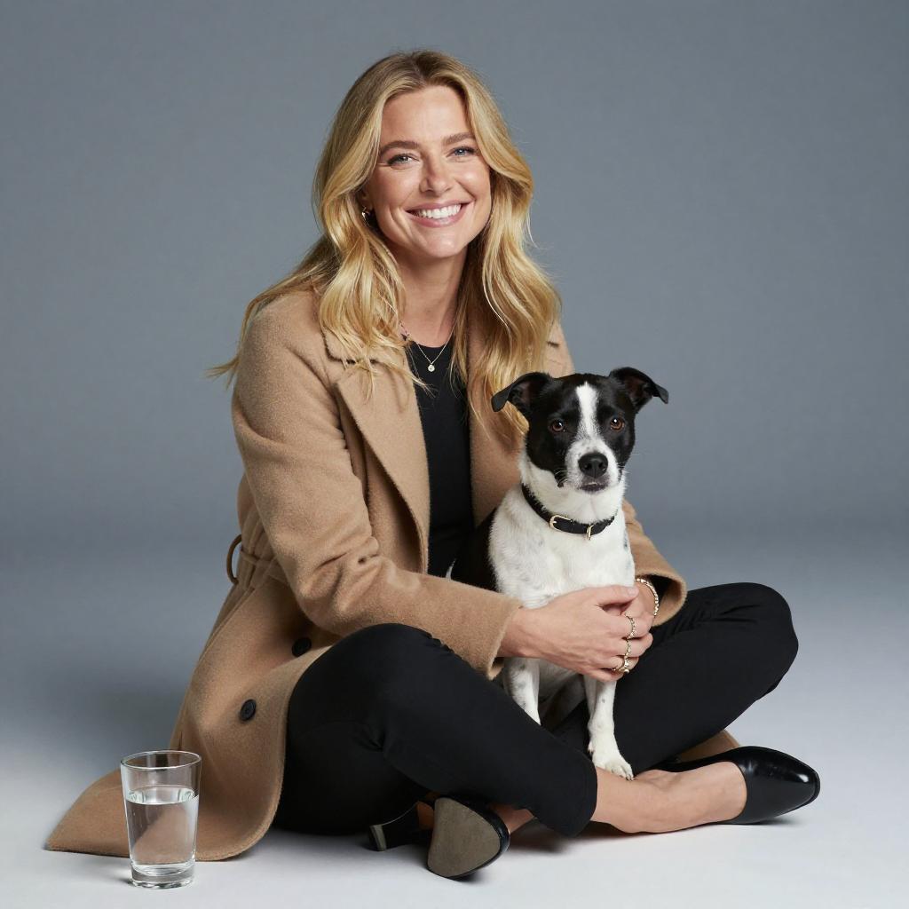 Photograph of a smiling blonde woman with long hair, wearing a tan coat and black pants, sitting on the floor against a blue gradient background. She holds a black and white dog on her lap. A clear glass is on the floor to her left.