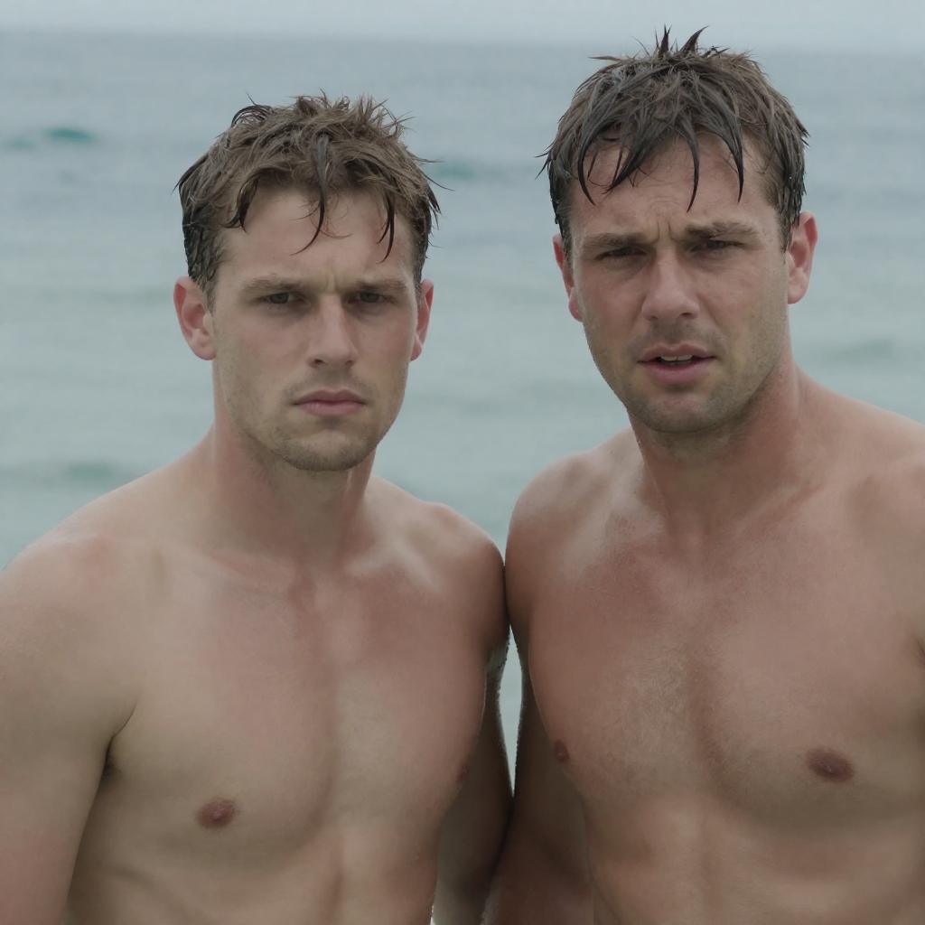 Photograph of two shirtless men with wet hair, standing close together in the ocean. The man on the left has a serious expression, while the man on the right looks slightly distressed. Both have light skin and short brown hair. The background shows a blurred, blue ocean.