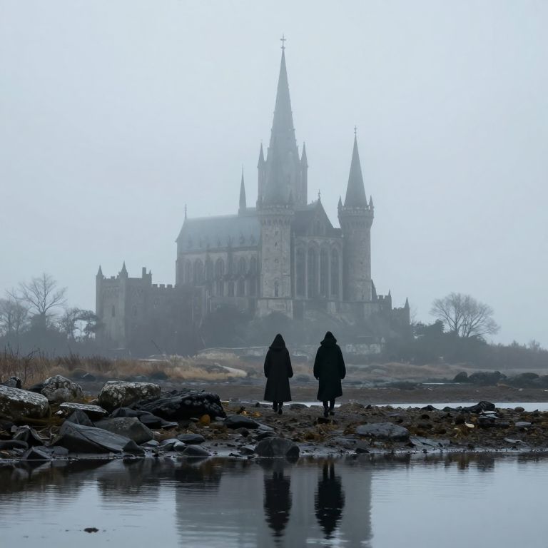 Mist-shrouded castle towers majestically above a desolate landscape, its spires piercing the hazy sky as two cloaked figures walk toward it along a rocky shoreline, their silhouettes mirrored faintly in the still waters below.