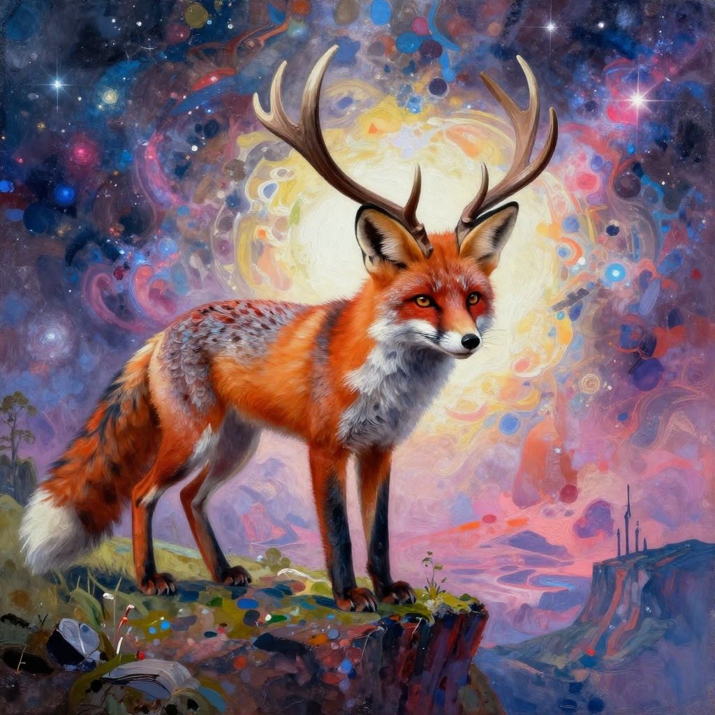 Digital painting of a regal, red fox with antlers standing on a cliff, surrounded by a vibrant, cosmic, multicolored sky.