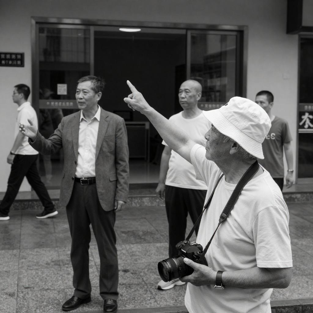 Black-and-white photograph of two men preparing a large fish. Man on left, dark hair, holding knife, intense focus. Man on right, bald, assisting, focused. Fish on table, head facing left. Dark background. Text on right side.