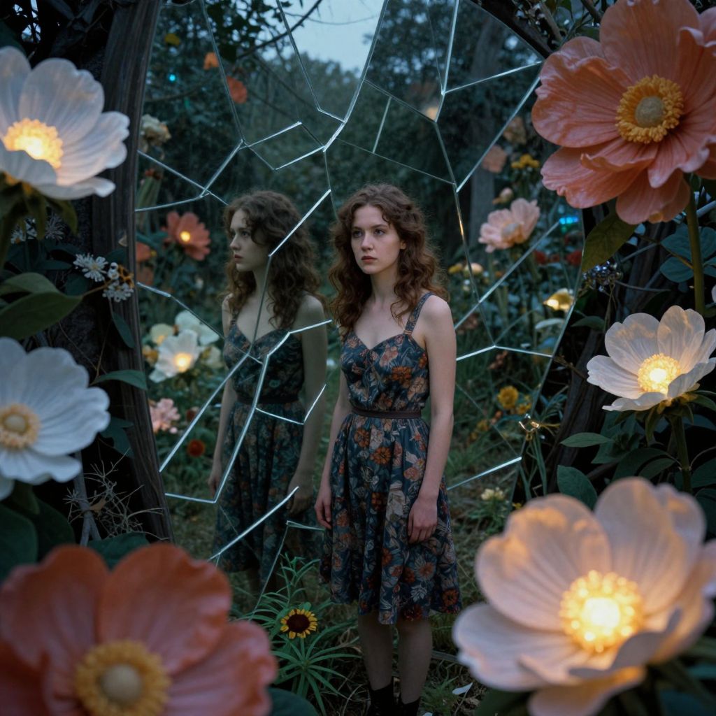 Photograph of a young woman with wavy brown hair, wearing a floral sundress, standing in front of a shattered mirror surrounded by large, glowing flowers with illuminated centers. The mirror's broken glass reflects her solemn expression. The background is a lush garden with green foliage and more colorful flowers. The scene has a dreamy, surreal quality, with a mix of natural and artificial light creating a mystical atmosphere. The woman is centered in the image, with the flowers and mirror fragments framing her.