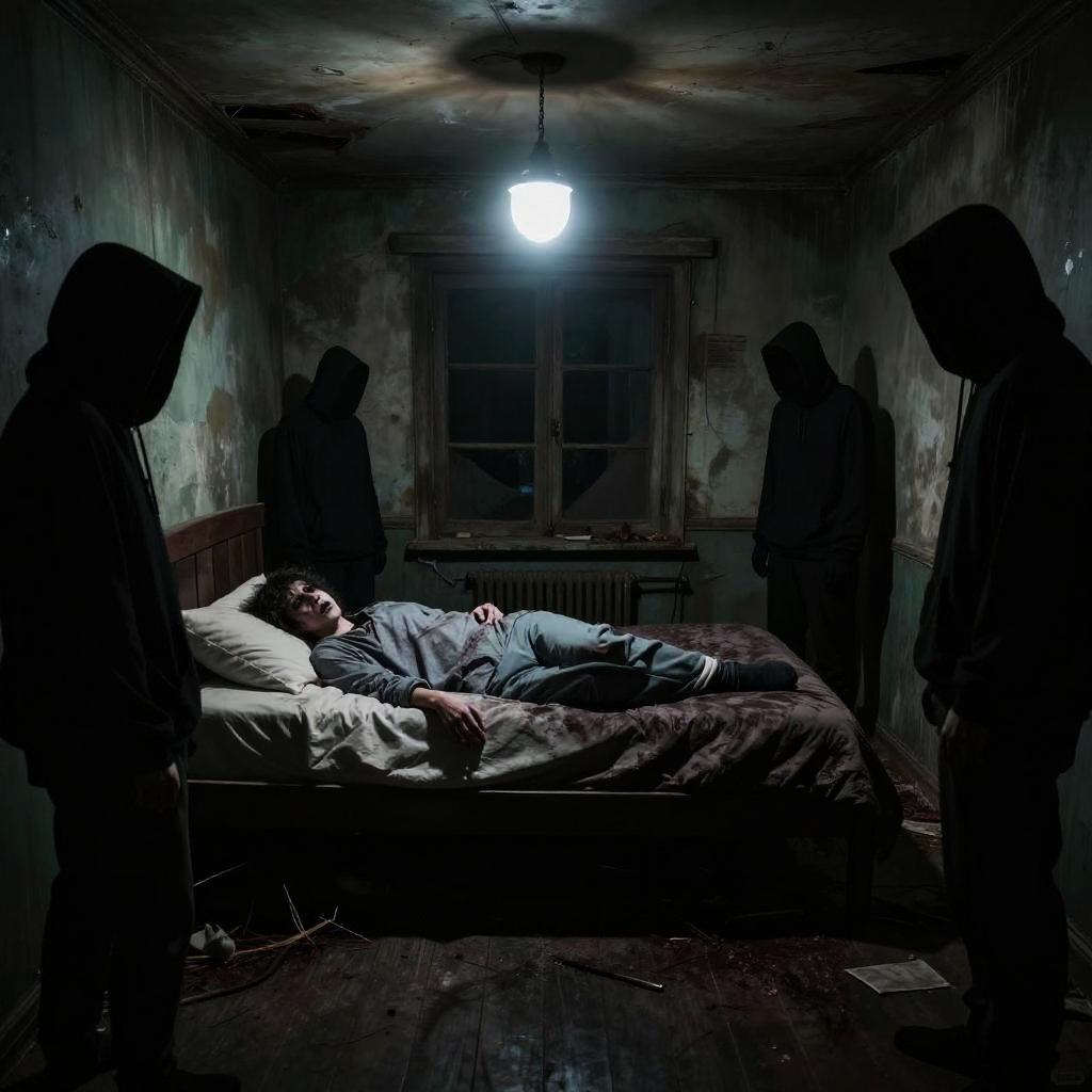 Creepypasta sleep experiment featuring a haunted, decrepit room with flickering lights, mysterious silhouettes watching a terrified person in isolation, intense psychological horror vibes