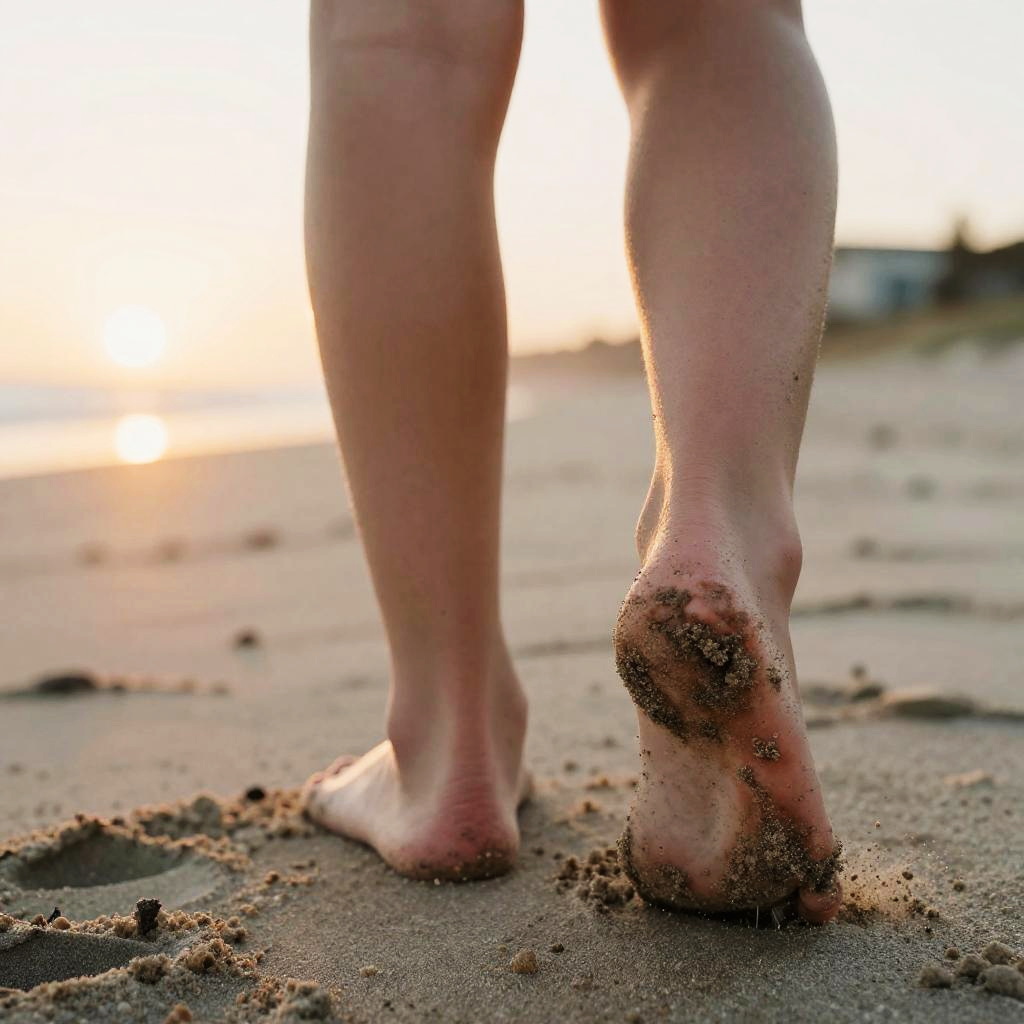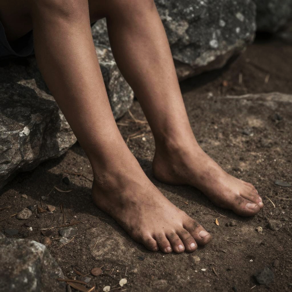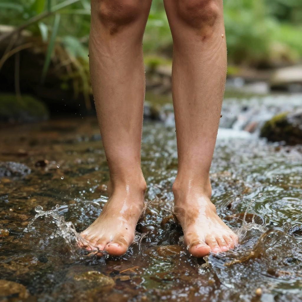 Dirty teen feet splashing through a shallow creek, droplets of water and mud flying, natural outdoor setting with green foliage, highly detailed and dynamic