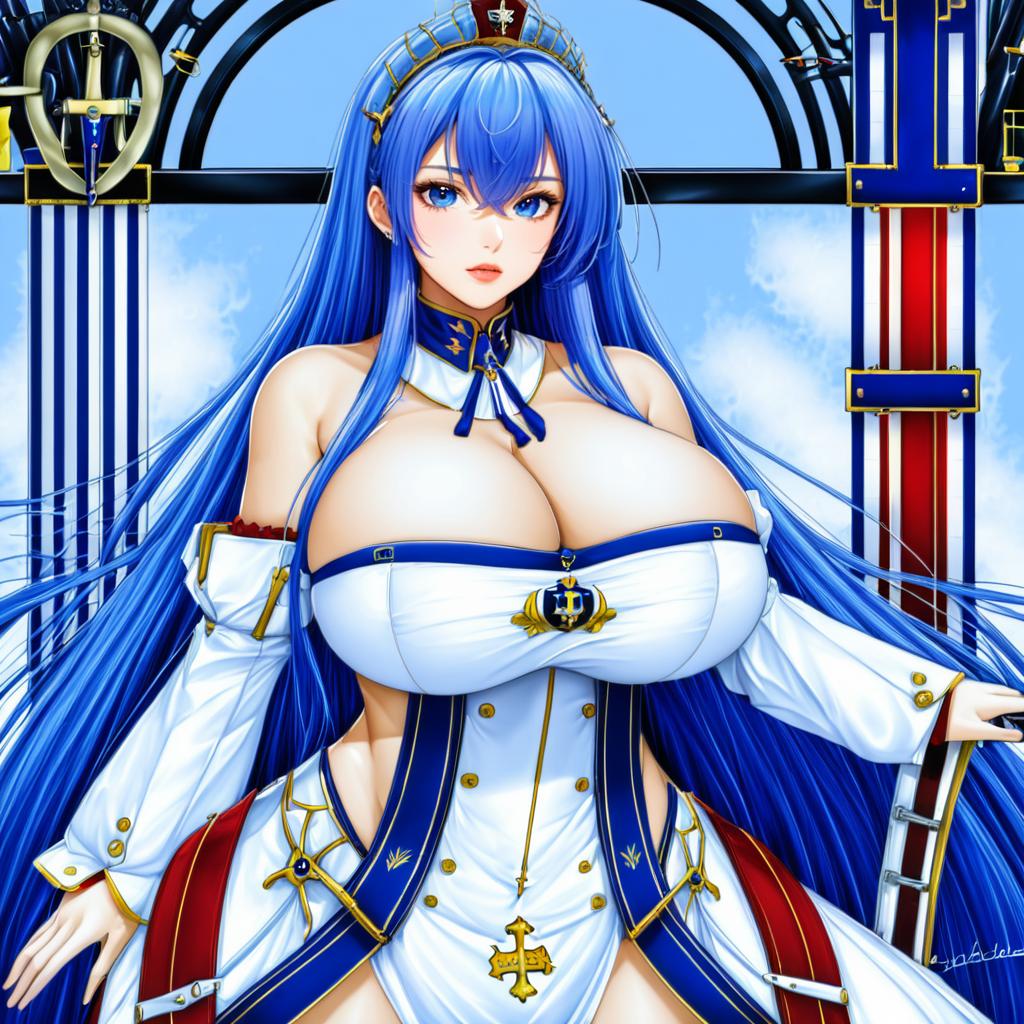 Alsace (azur lane), azur lane, 1girl, blue eyes, blue hair, very long hair, parted bangs, sidelocks, large breasts, huge breasts, cleavage, breast strap, thighs, navel, skindentation, bare shoulders, detached collar, blue ribbon, tiara, black tiara, by artist hyudora, anime