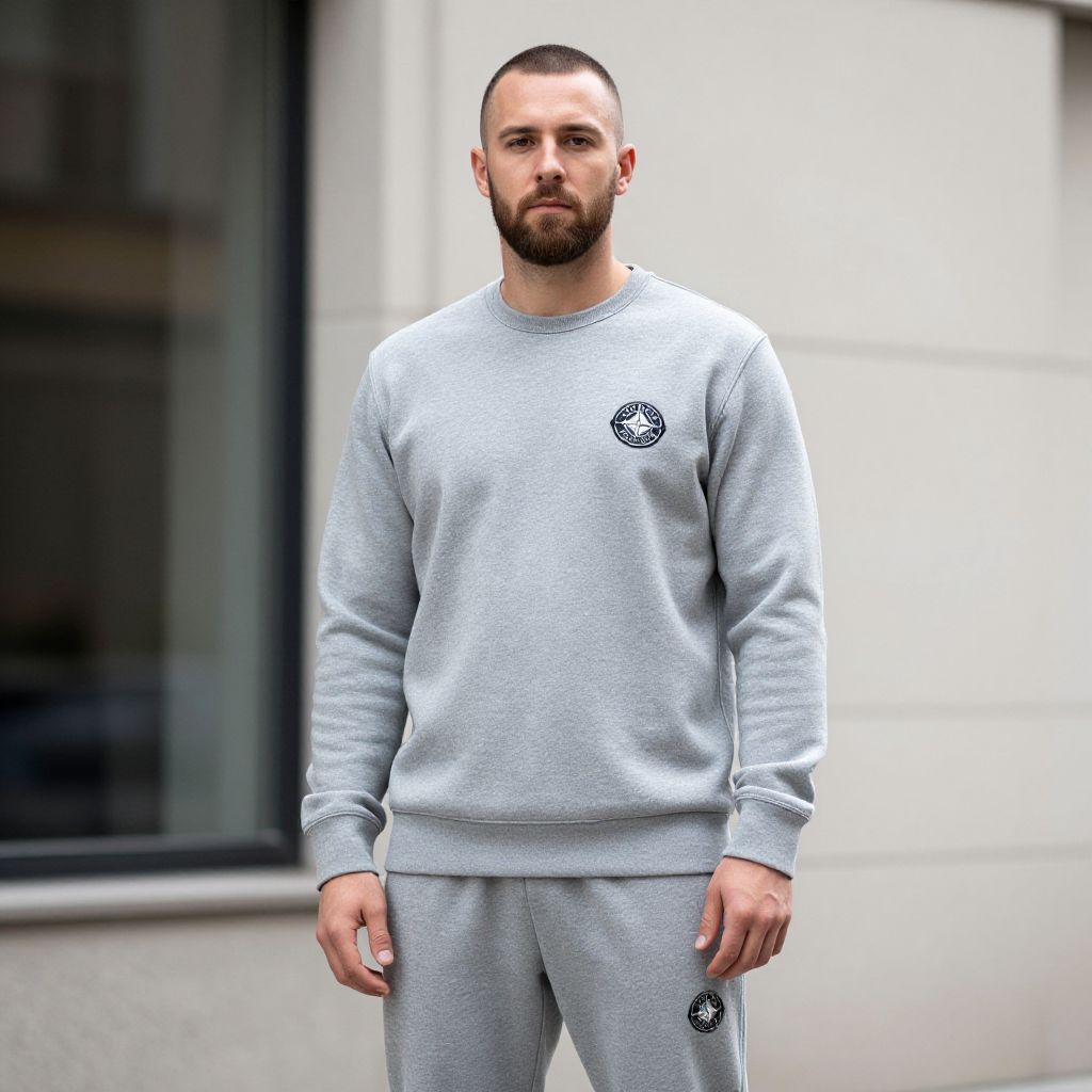 Man with short hair and beard wearing a grey sweatshirt with a stone island logo on the front and a pair of grey sweatpants with a black logo on them. He is standing in front of a building with a large window on the left side.