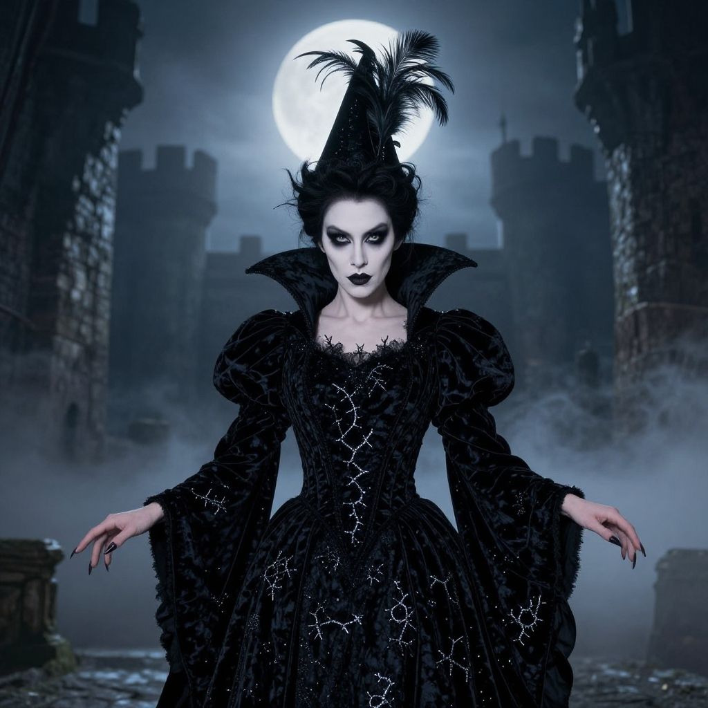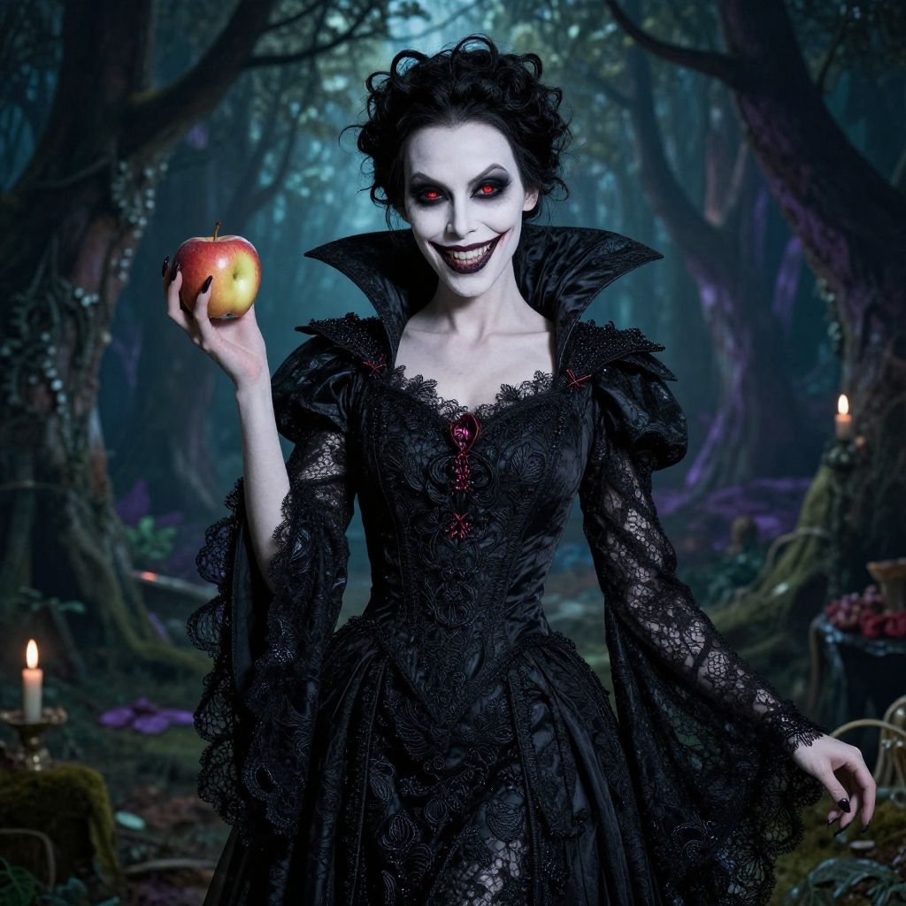 Evil stepmother costume full body shot, dramatic layered gown in shades of black and deep purple, billowing cape with shimmering spider silk patterns, cruel smirk with arched eyebrows, enchanted cursed berries scattered on the floor, dark enchanted forest backdrop.