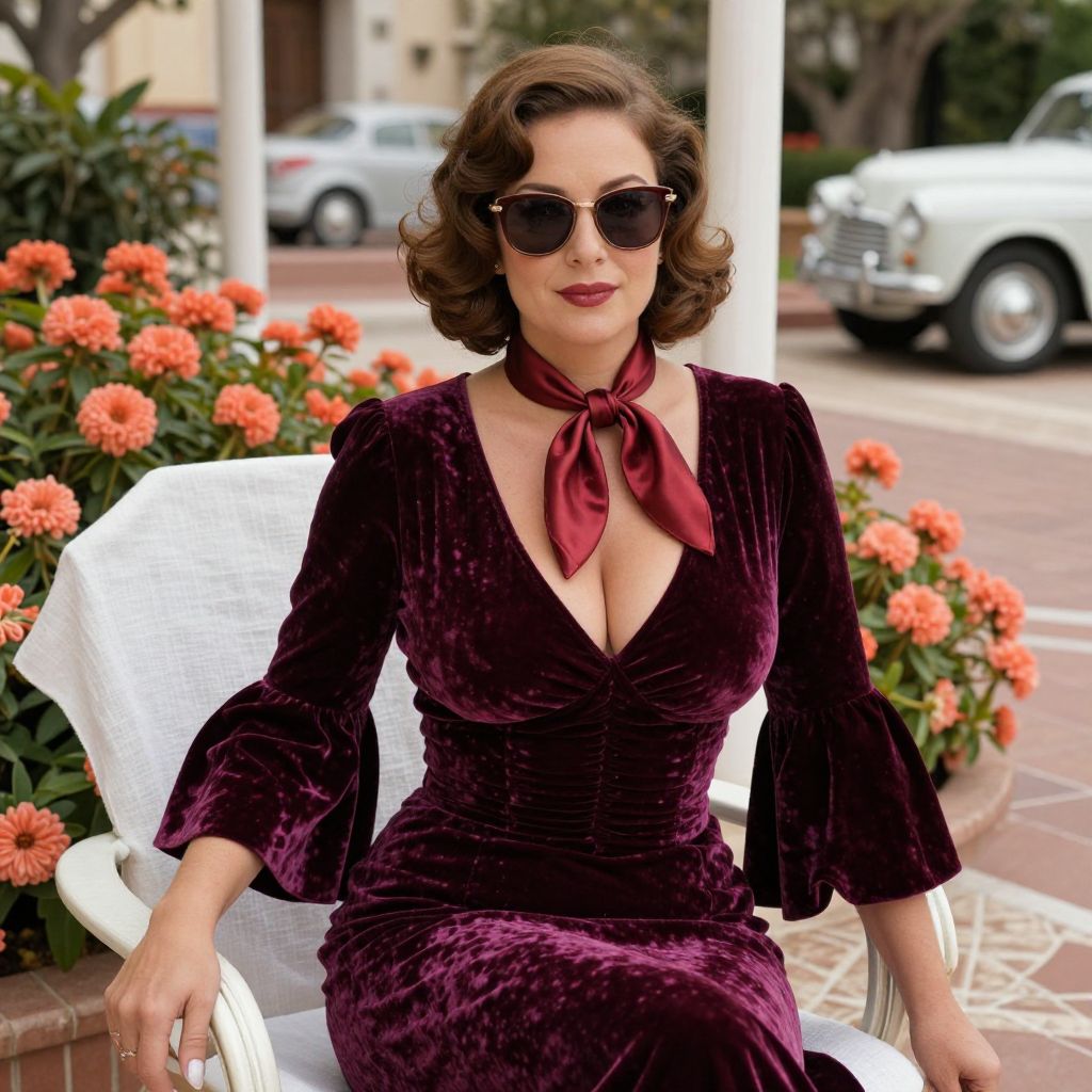 Photograph of a woman with fair skin and brown, wavy hair styled in vintage curls. She wears dark sunglasses, a deep purple velvet dress with a plunging neckline, and a matching red satin scarf tied around her neck. Her dress highlights her ample cleavage. She sits on a white chair, surrounded by orange flowers in planters, on a red-tiled sidewalk. In the background, there are blurred cars and greenery. The scene exudes a retro, 1950s vibe, with the woman's attire and styling contributing to the vintage aesthetic.