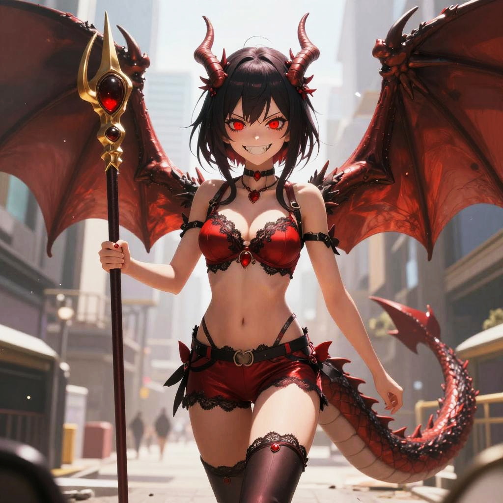 Score_9, score_8_up, score_7_up, source_anime, extremely detailed, volumetric lighting, 8k wallpaper, best quality, ultra-detailed, best illustration, detailed shadows, (tracing), realistic, colorful, intense shadows, detailed face, 4k, highres, absurdres, light particles, sunlight, 4k wallpaper, backlighting, (very wide shot), 1girl, (full body), evil grin, yandere, red eyes, dragon girl, (yandere trance), dragon tail, dragon horns, holding staff, wings, (dragon wings), red bra with black lace, short shorts, thigh boots, looking at viewer, detailed eyes, city background, LORA