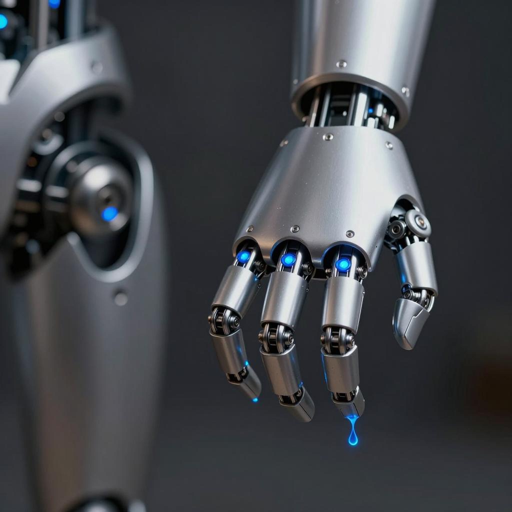 Close-up photorealistic image of a silver robotic hand and forearm featuring detailed mechanical components. The robot's fingers emit glowing blue lights with blue energy droplets dripping from the fingertips. The dark, blurred background highlights the advanced technology and sleek design of this futuristic robot hand.